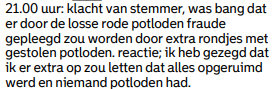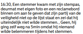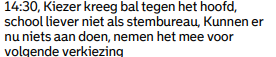 Een stembureau op een school brengt voor- én nadelen met zich mee. Zo kreeg een stemmer een bal tegen zijn of haar hoofd. Het zorgde voor een ontstemde kiezer, al kon er op dat moment al niks meer aan gedaan worden. “We nemen het mee voor de volgende verkiezingen”, valt te lezen.