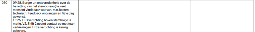 Medewerkers op een stembureau zitten er om de democratie te helpen, maar krijgen ook een vergoeding daarvoor. Dat zat één persoon niet lekker, die volgens het klachtenoverzicht zijn ontevredenheid uitte over het aantal mensen op een stembureau. “Vindt daar wat van”, valt verder te lezen. “Met name kostentechnisch. We hebben de feedback ontvangen en een fijne dag gewenst.”
