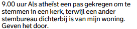 Je zou er de humor van in kunnen zien, maar misschien ook wel niet: een persoon heeft geklaagd over het stembureau zelf. Het bureau zat namelijk in een kerk, terwijl de persoon in kwestie een atheïst is. Als opmerking staat er nog bij dat de klacht formeel is doorgegeven.