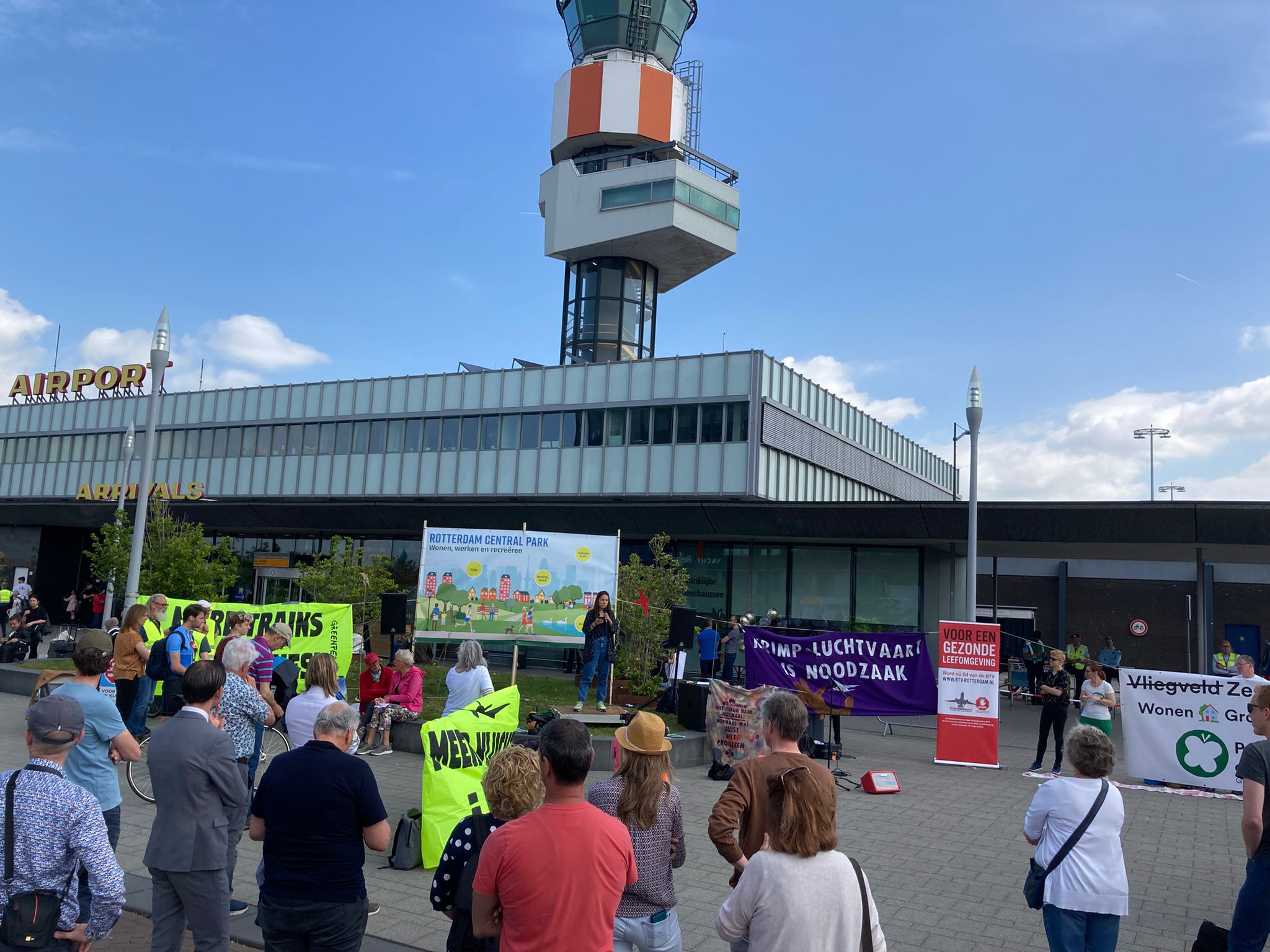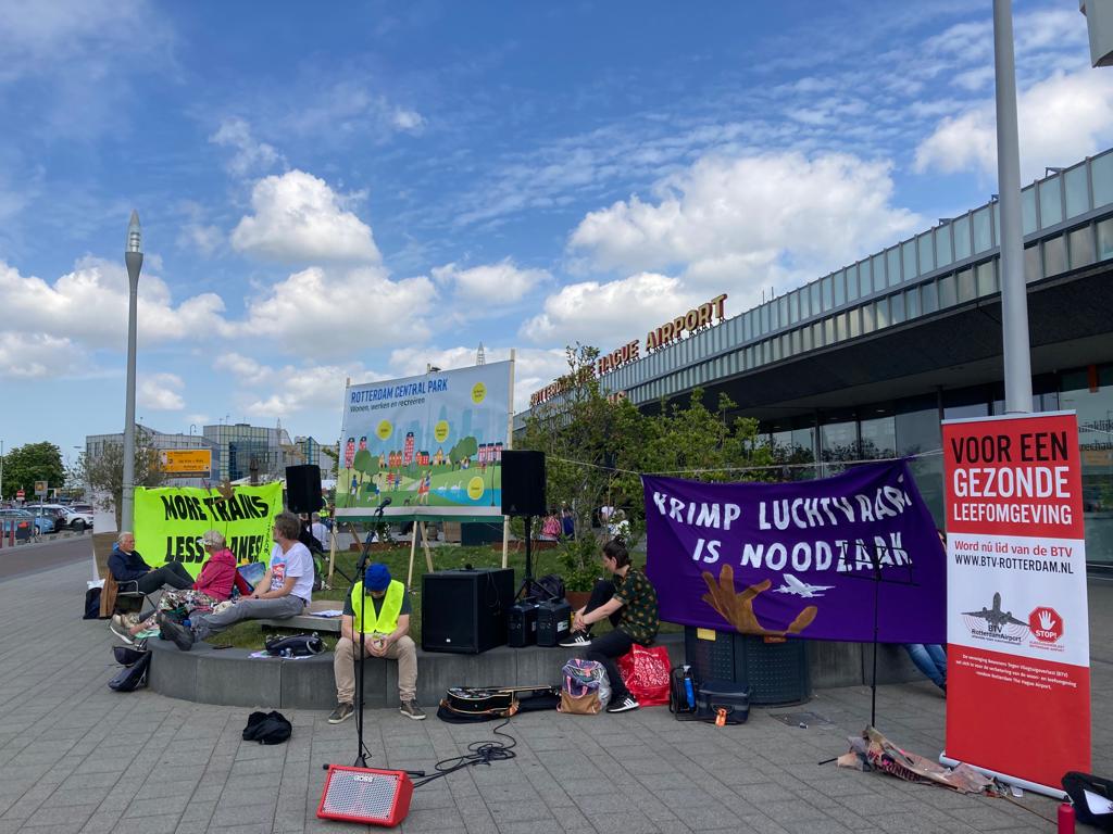 Dit weekend verzamelden zich bij vliegvelden door heel Nederland actievoerders om aandacht te vragen voor de overlast die vliegverkeer geeft. Ook bij Rotterdam-The Hague Airport, Zestienhoven in de volksmond, waren zo’n honderd mensen om te protesteren tegen vliegtuigoverlast.