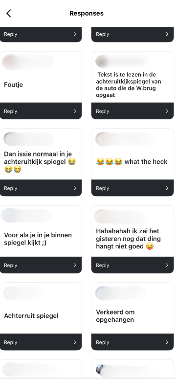 Op Instagram deelden wij deze week een foto van de advertentie. ‘Is de poster verkeerd gedrukt of verhoogt dit de publiciteit?’, vroegen we aan onze volgers. Daarop kwamen allerlei reacties. Bijvoorbeeld dat de tekst dan wél goed te lezen is als je kijkt in je achteruitspiegel. ‘Als je wegrijdt uit Rotterdam, dan kun je het wel goed lezen in de achteruitkijkspiegel!’