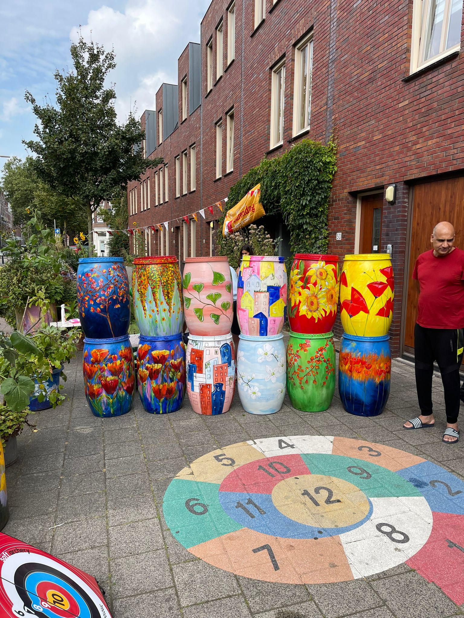 Bert Knaap en Renée Balsters hebben deze tonnen beschilderd en zijn hierin ondersteund door initiatiefnemer en bewoner van de Albregt-Engelmanstraat Giovanni Burke. Samen hebben zij de handen ineengeslagen om de straat verder op te fleuren door meer van de befaamde plantenbakken neer te zetten met steun van Opzoomer mee.