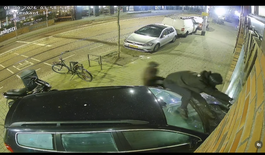 De twee inbrekers rijden op de winkel in. Eén stapt uit en probeert binnen te komen, maar dat lukt niet. Alleen het raam is gebroken: het rolluik daarachter is nog intact. De tweede komt aanrijden op een scooter. Als de inbrekers merken dat ze niet binnenkomen, rijden ze snel weg op de scooter.