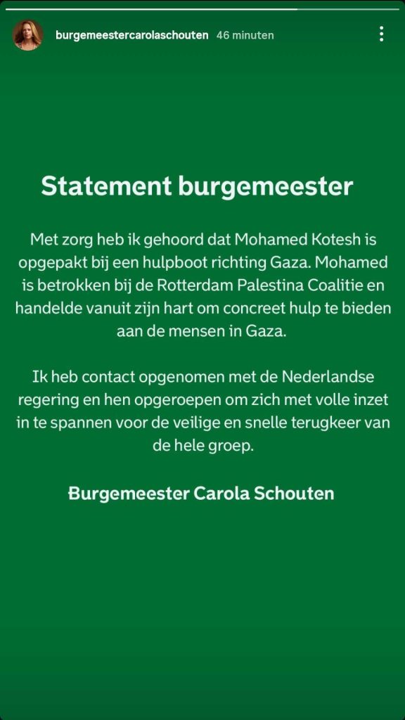 De burgemeester laat via Instagram Stories het volgende weten: ‘Met zorg heb ik gehoord dat Mohamed Kotesh is opgepakt bij een hulpboot richting Gaza. Mohamed is betrokken bij de Rotterdam Palestina Coalitie en handelde vanuit zijn hart om concreet hulp te bieden aan de mensen in Gaza. Ik heb contact opgenomen met de Nederlandse regering en hen opgeroepen om zich met volle inzet in te spannen voor de veilige en snelle terugkeer van de hele groep.’