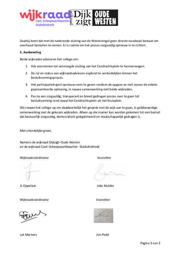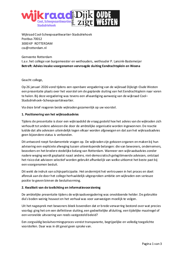 Het voorstel om de afsluiting van Eendrachtsplein en Weena naar voren te halen roepen veel weerstand op. Volgens de wijkraden van Cool-Scheepvaartkwartier-Stadsdriehoek en Dijkzigt-Oude Westen schieten de plannen flink te kort: de onderbouwing is onduidelijk, het participatieproces rammelt en het is niet helder wat er precies gaat gebeuren. Ook stellen zij dat hun rol als gekozen orgaan onvoldoende serieus wordt genomen.