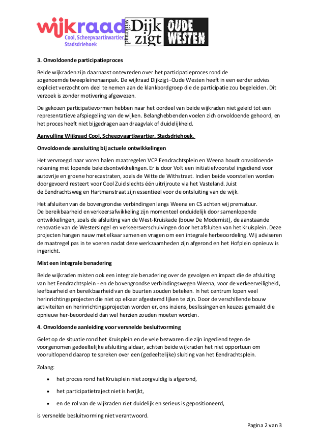 Het voorstel om de afsluiting van Eendrachtsplein en Weena naar voren te halen roepen veel weerstand op. Volgens de wijkraden van Cool-Scheepvaartkwartier-Stadsdriehoek en Dijkzigt-Oude Westen schieten de plannen flink te kort: de onderbouwing is onduidelijk, het participatieproces rammelt en het is niet helder wat er precies gaat gebeuren. Ook stellen zij dat hun rol als gekozen orgaan onvoldoende serieus wordt genomen.