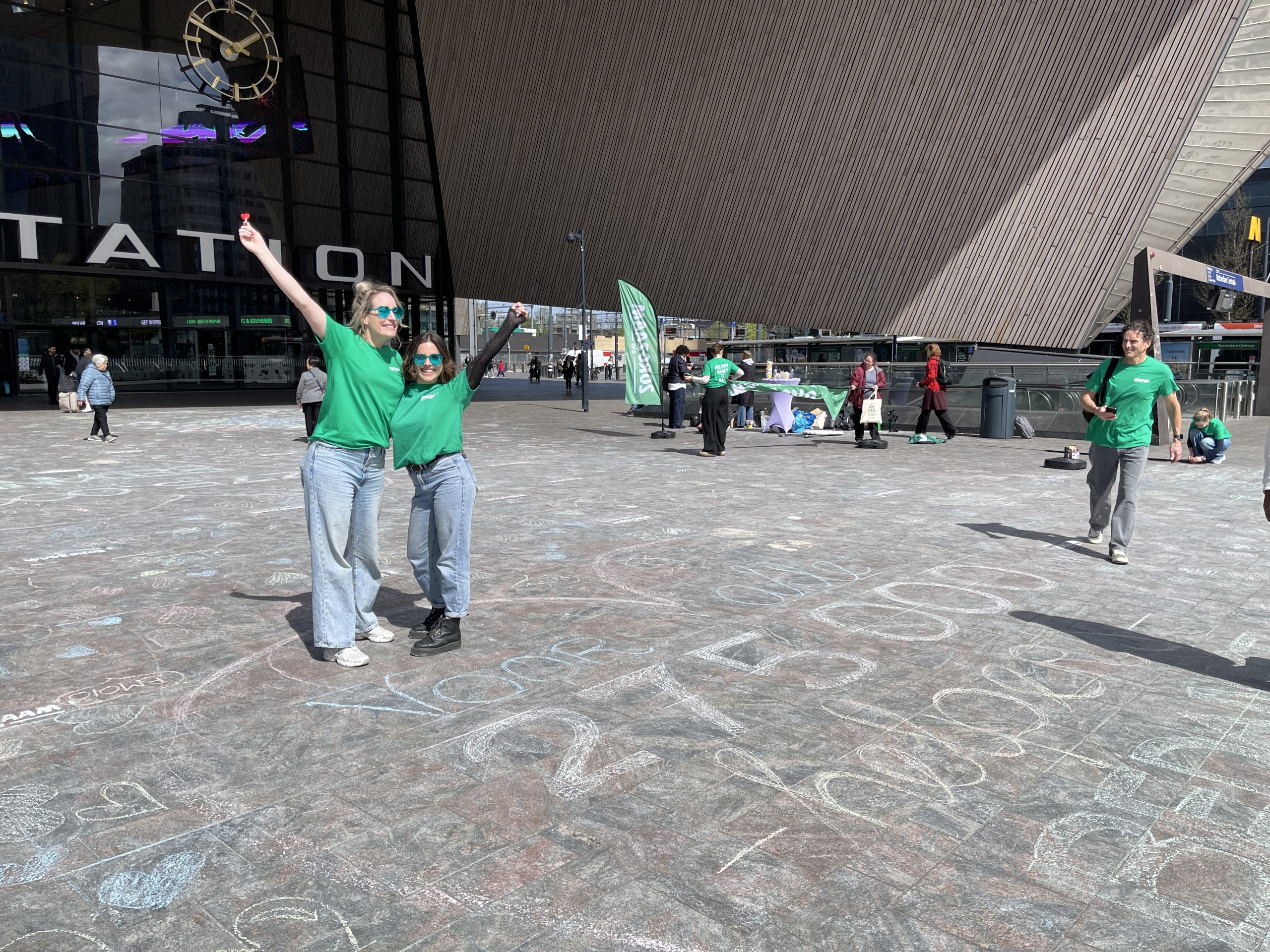 Onder het lentezonnetje kleurde het Stationsplein langzaam roze, rood, geel en blauw. Honderden Rotterdammers gingen op 16 april met stoepkrijt aan de slag en tekenden samen duizenden hartjes op de grond als bedankje voor vrijwilligers in de stad. Daarbij deden ze een poging om het wereldrecord van 9.000 stoepkrijthartjes te verbreken.