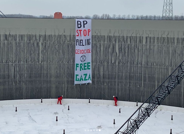 Extinction Rebellion Justice Now heeft een banner opgehangen aan de BP raffinaderij in Rotterdam met de tekst: “Stop fueling genocide, Free Gaza”. Zij eisen dat BP onmiddellijk de samenwerking met Israël stopt en hiermee ook het exploiteren van de genocide in Palestina voor zakelijk gewin. “BP Rotterdam zegt niks te maken te hebben met BP in Gaza, maar wij van Extinction Rebellion zijn het hier niet mee eens.”