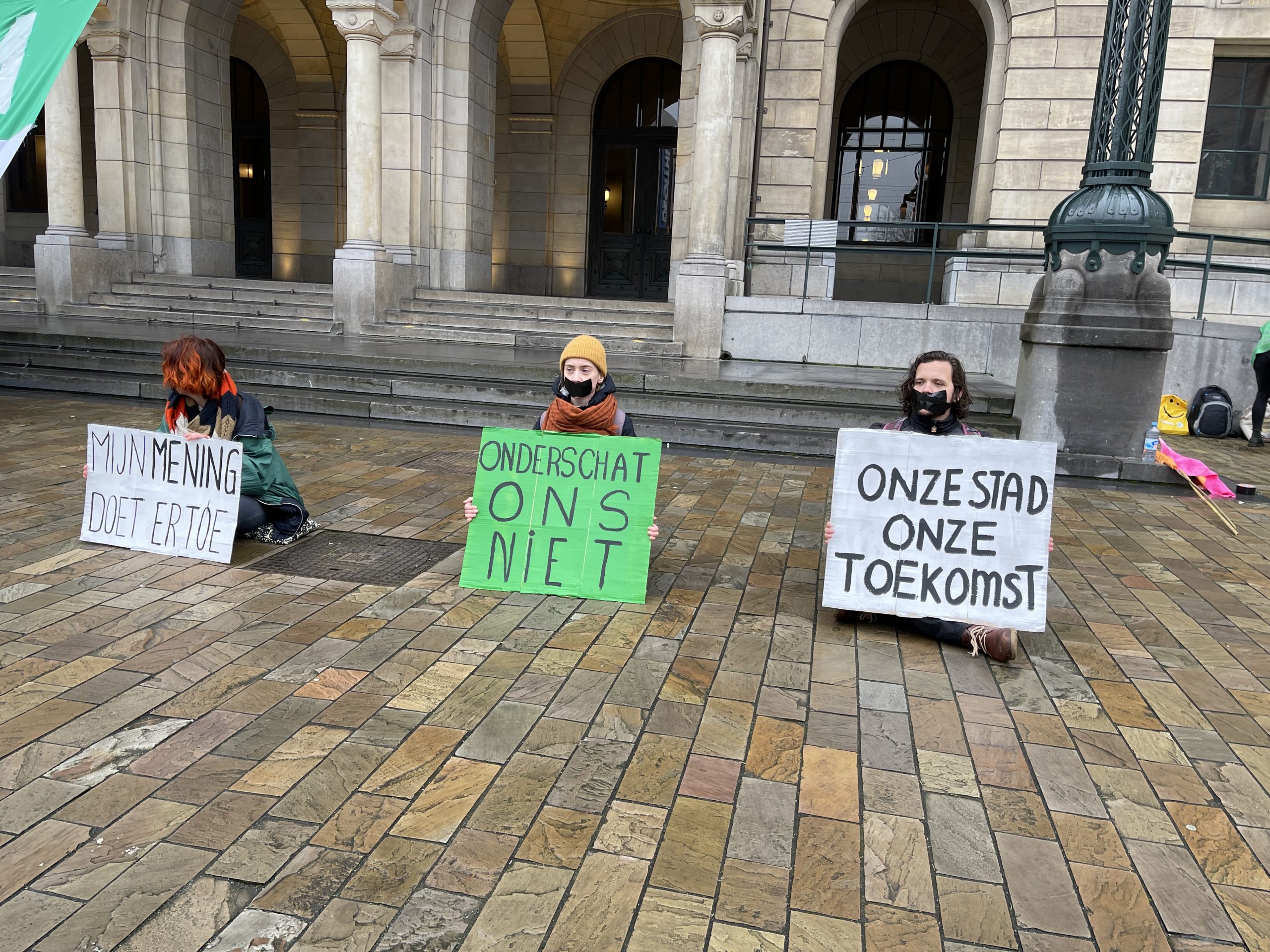 ? Klimaatbeweging @XR_Rotterdam voert actie bij het stadhuis. De organisatie roept de stad op om klimaatneutraal te zijn in 2025. pic.twitter.com/k3liTiUv6H