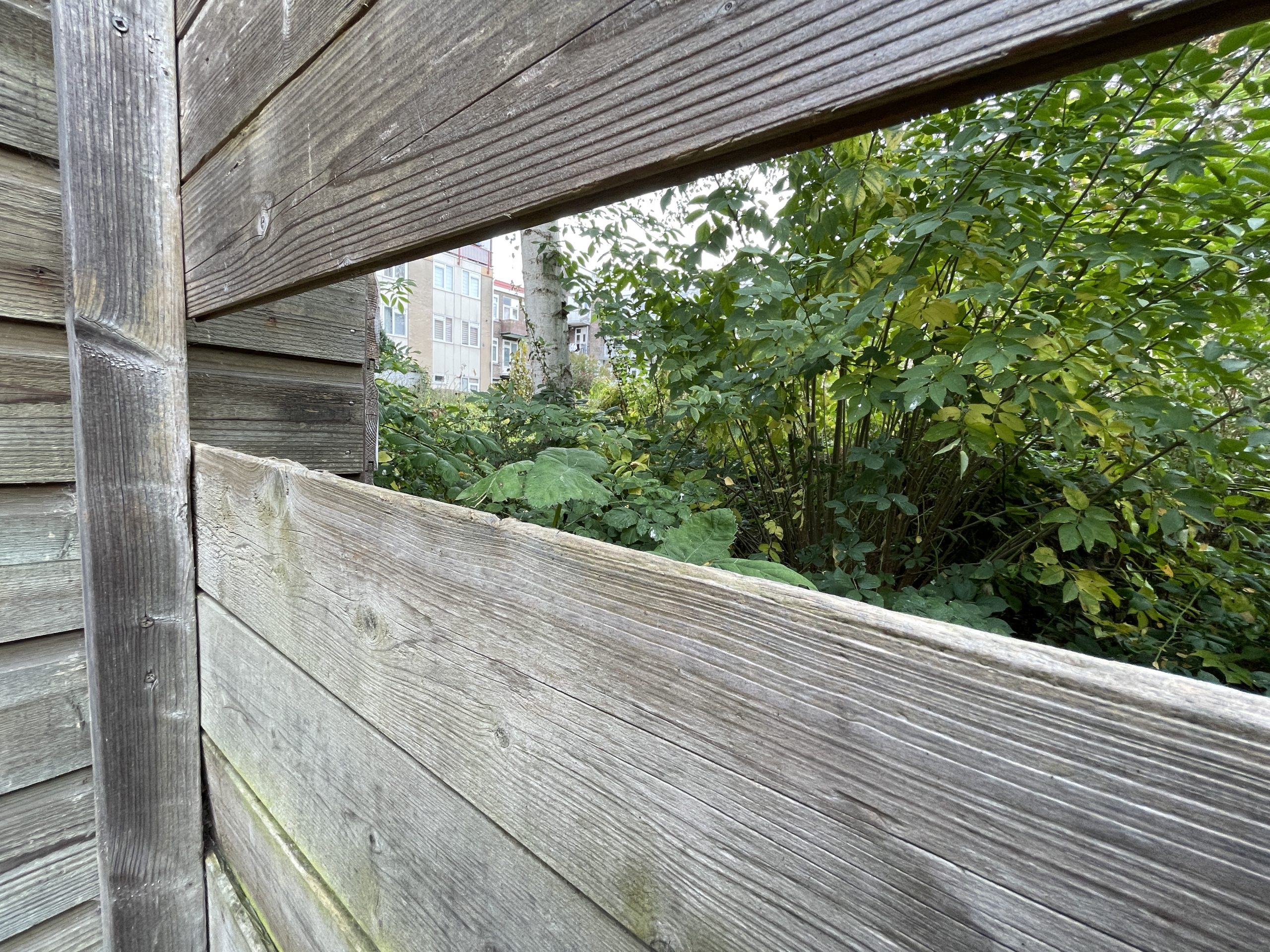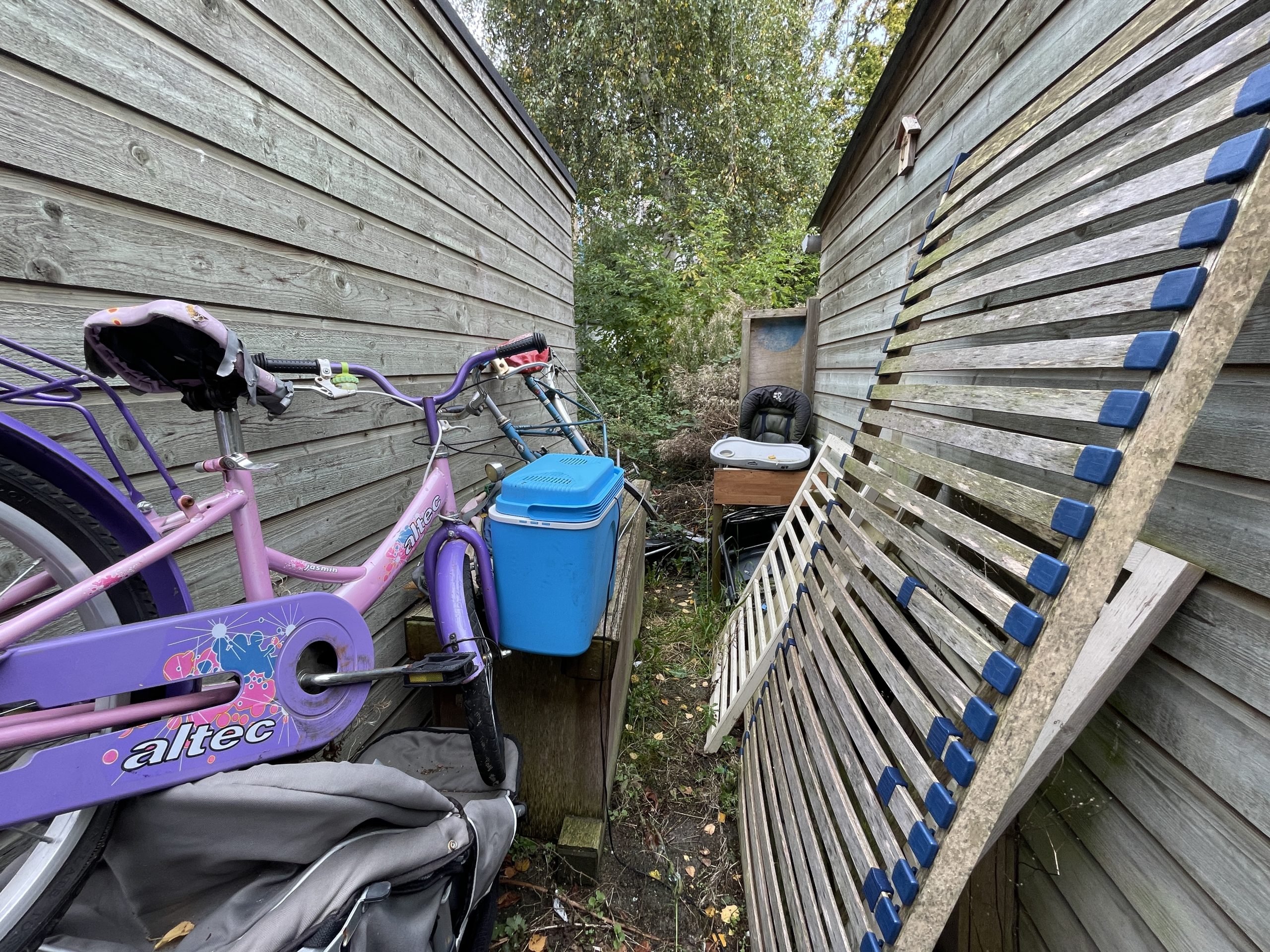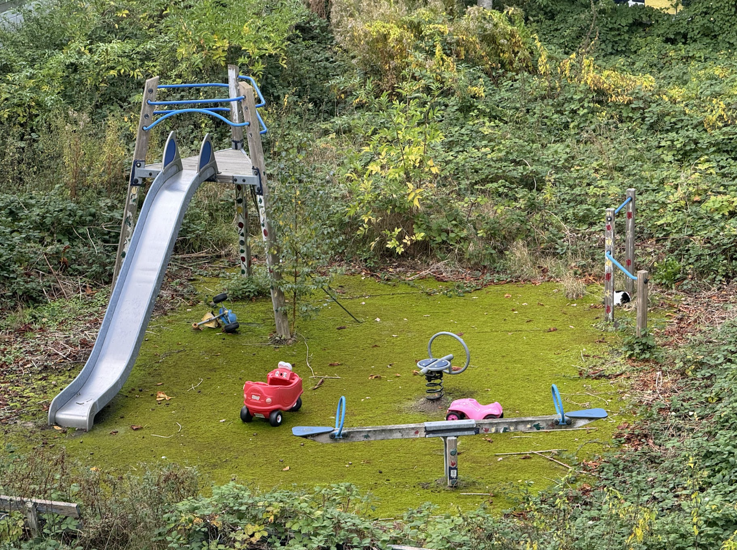 In het midden van de tuin zie je enkel nog de overblijfselen van wat ooit een speeltuin was: een glijbaan, een wip en een rood loopautootje voor kleine kinderen. “Daar heeft mijn zoon vijf jaar geleden nog ingezeten,” vertelt de bewoonster. Haar zoon is inmiddels 10. Het autootje is nooit meer van die plek af geweest en de tuin is volgens de huurders een jaar door de gemeente afgesloten met een nieuw, groen hek. De particuliere huurders kunnen dus sowieso geen gebruik meer maken van de tuin, iets wat Woonstad eigenlijk wél graag zou zien.
