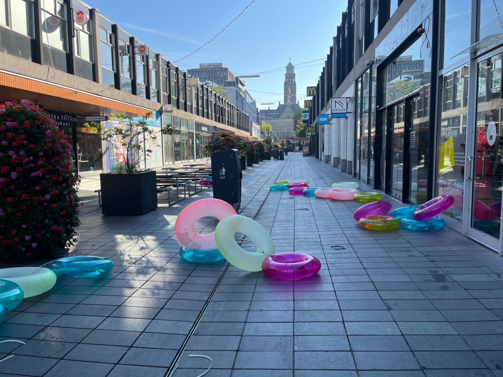 Passanten op de Lijnbaan liepen vrijdagochtend door een slagveld van verdwaalde zwembanden en halfhangende slingers. Op een trolleykar zijn leeggelopen banden neergelegd. Een medewerker op een hoogwerker knipt de tie-wraps waarmee de zwembanden zijn vastgemaakt, één voor één los. De lucht ziet er weer ouderwets ‘kaal’ uit.