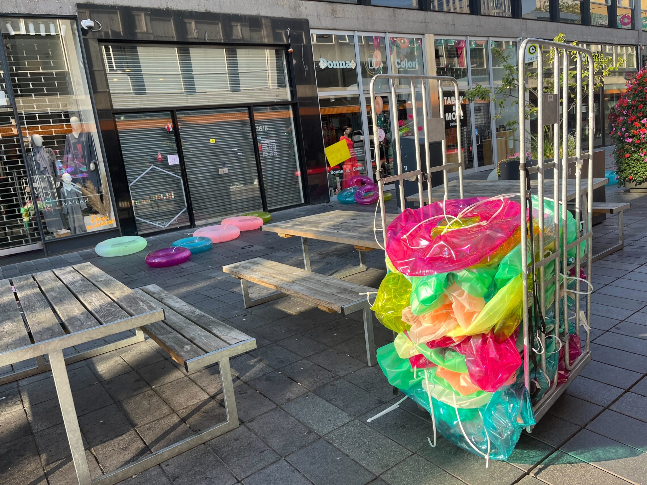 Passanten op de Lijnbaan liepen vrijdagochtend door een slagveld van verdwaalde zwembanden en halfhangende slingers. Op een trolleykar zijn leeggelopen banden neergelegd. Een medewerker op een hoogwerker knipt de tie-wraps waarmee de zwembanden zijn vastgemaakt, één voor één los. De lucht ziet er weer ouderwets ‘kaal’ uit.