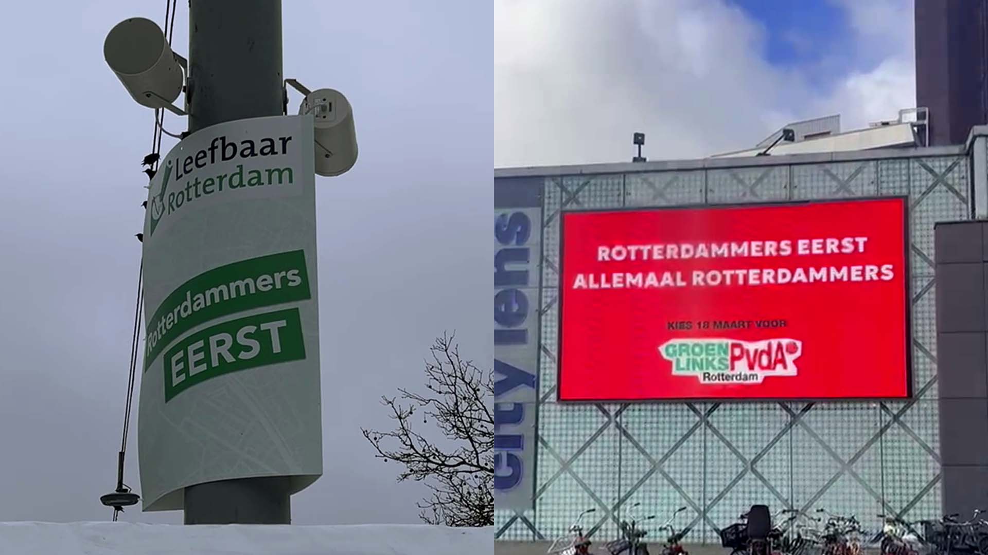GroenLinks/PvdA laat van zich horen. Op de Coolsingel staat een billboard met de tekst: “Allemaal Rotterdammers”. Hiermee refereren ze duidelijk aan de slogan van Leefbaar Rotterdam. Op het billboard is de slogan van Leefbaar Rotterdam doorgehaald, met daaronder deze nieuwe boodschap.
