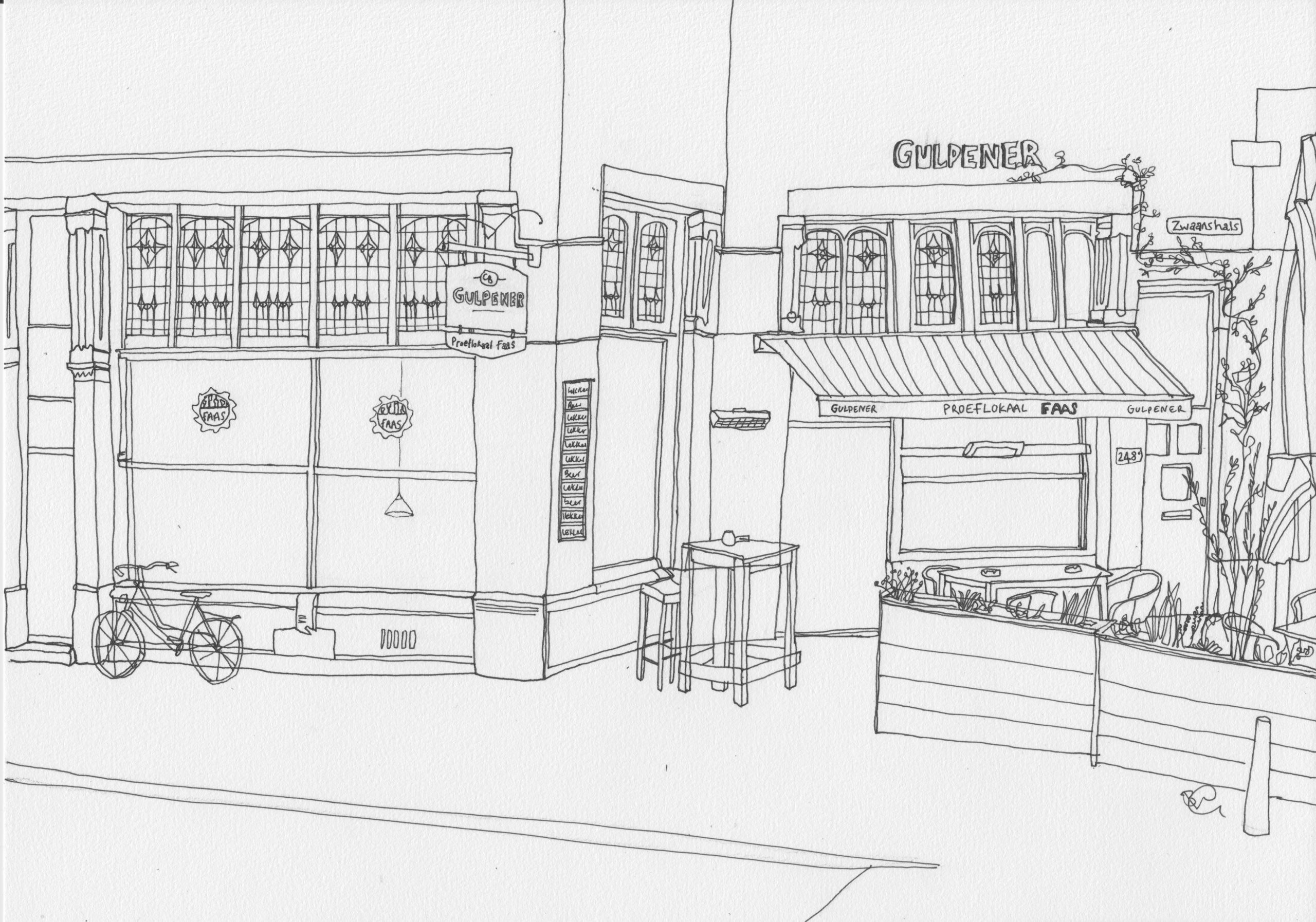 Een ode en steunbetuiging aan de horeca, dat zijn de tekeningen van Bea van Grutten. Haar naam doet anders vermoeden, maar deze dame komt oorspronkelijk uit Engeland. Een aantal jaren geleden verhuisde ze voor haar studie Design naar Eindhoven, maar sinds een aantal maanden woont ze in ‘het coole’ Rotterdam. Om de horeca een hart onder de riem te steken pent Bea horecazaken op papier. Haar tekeningen verkoopt ze en een groot deel van de opbrengsten gaat naar de getekende zaak.