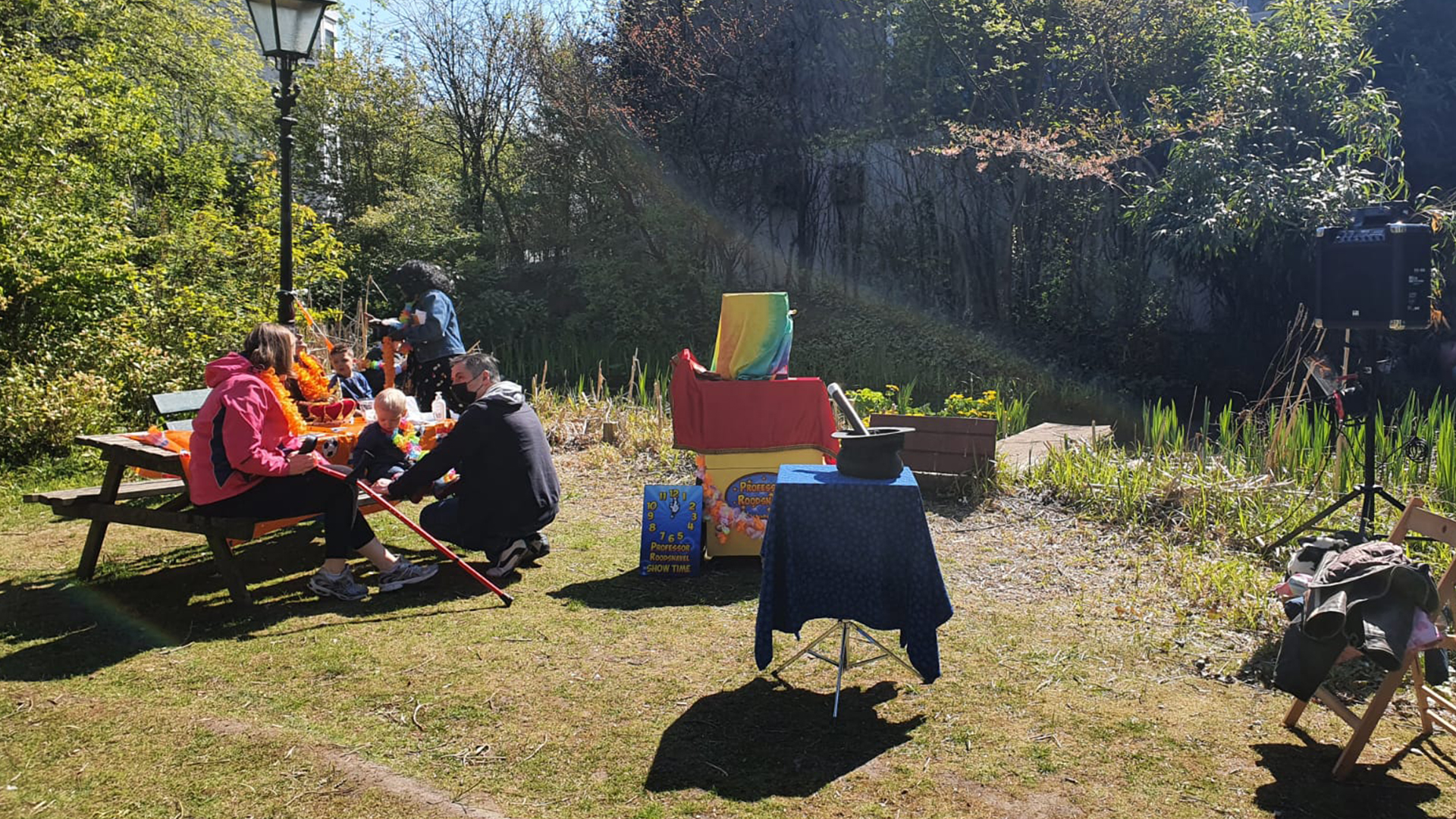 Reporters Zoë en Ko gaan naar de de binnentuin aan de Schoonderloostraat om mee te kijken met de goochelaar: Professor Roodsnavel (Harry Vogel).