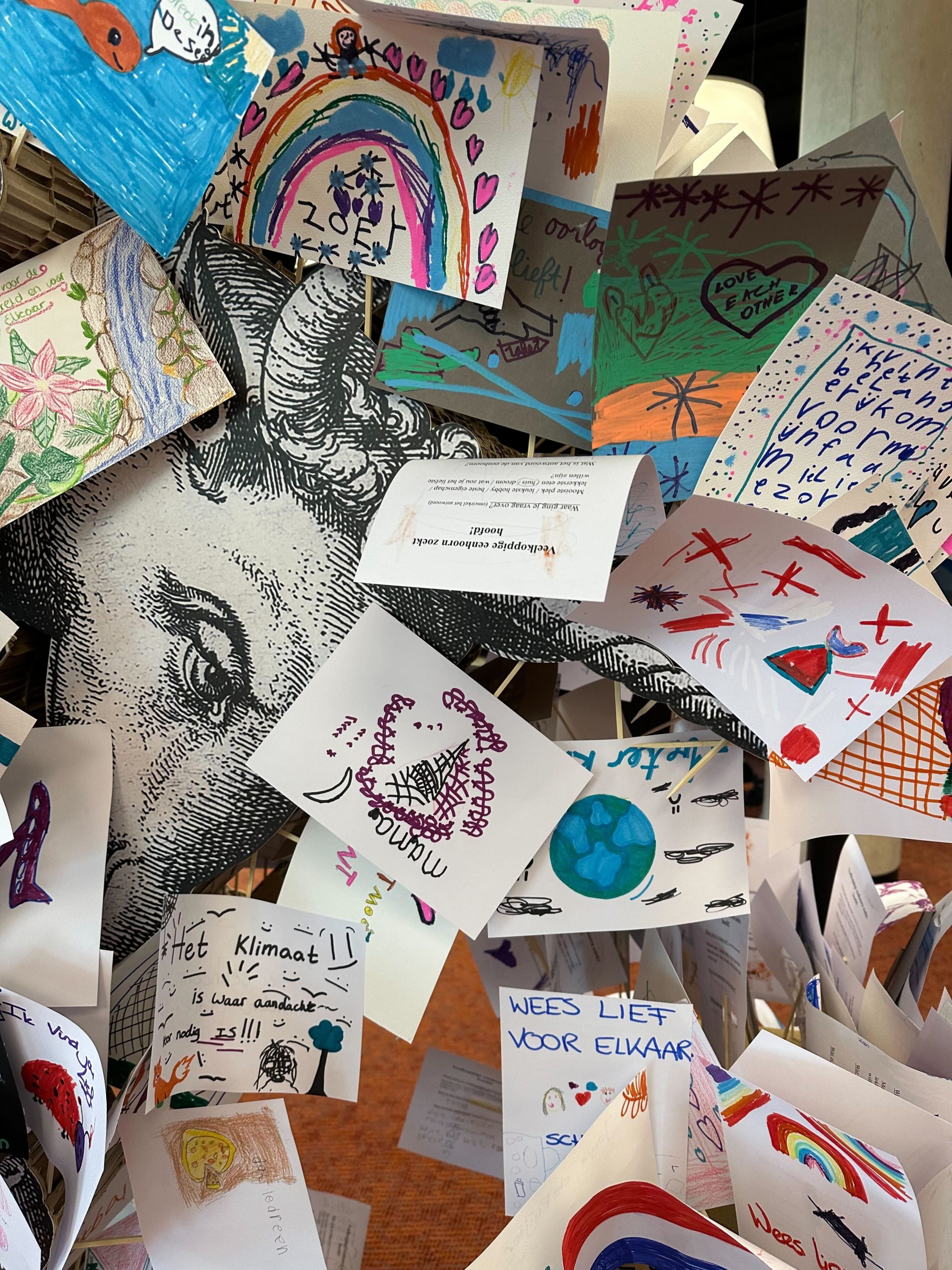 De ‘wens eenhoorn’, zoals de bibliotheek hem noemt, staat op de derde etage. Elk kind die een wens op een briefje schrijft, kan tot en met aanstaande vrijdag kan je hier een stempel voor verdienen met het Jeugd Vakantiepaspoort. De kleine Rotterdammers willen van alles goeds voor de wereld: ‘Ben wie je wil zijn’, ‘Lief zijn voor de natuur’ en ‘Ik wens vrede in de wereld’.