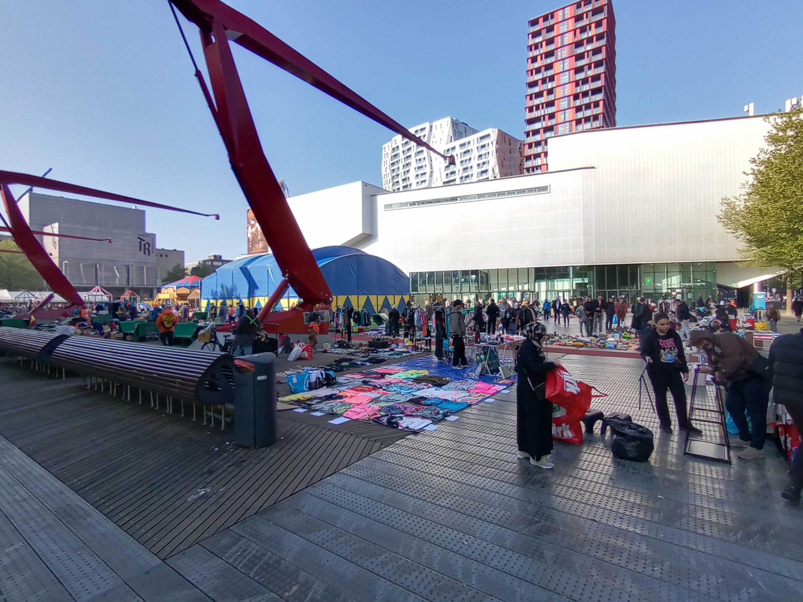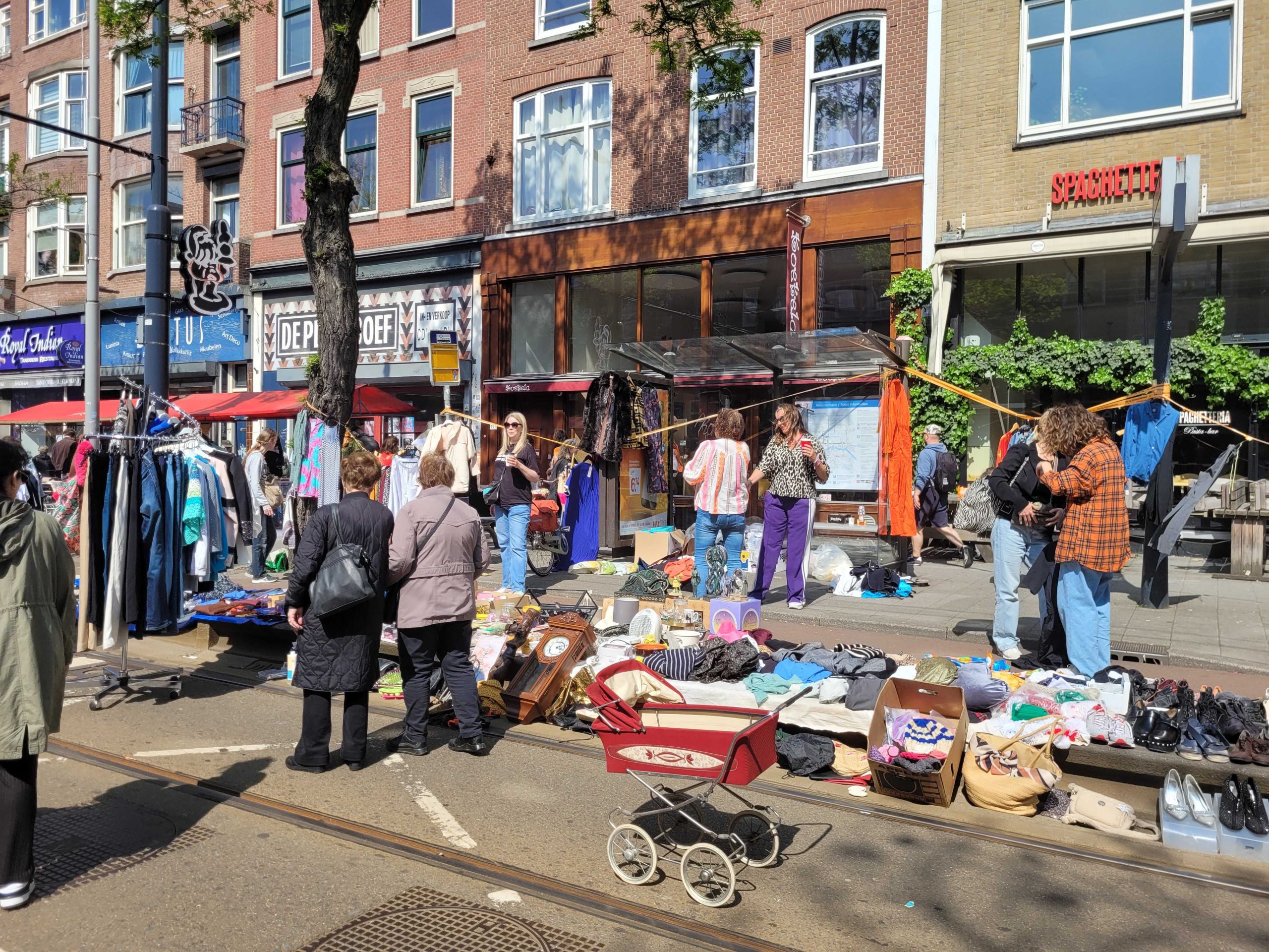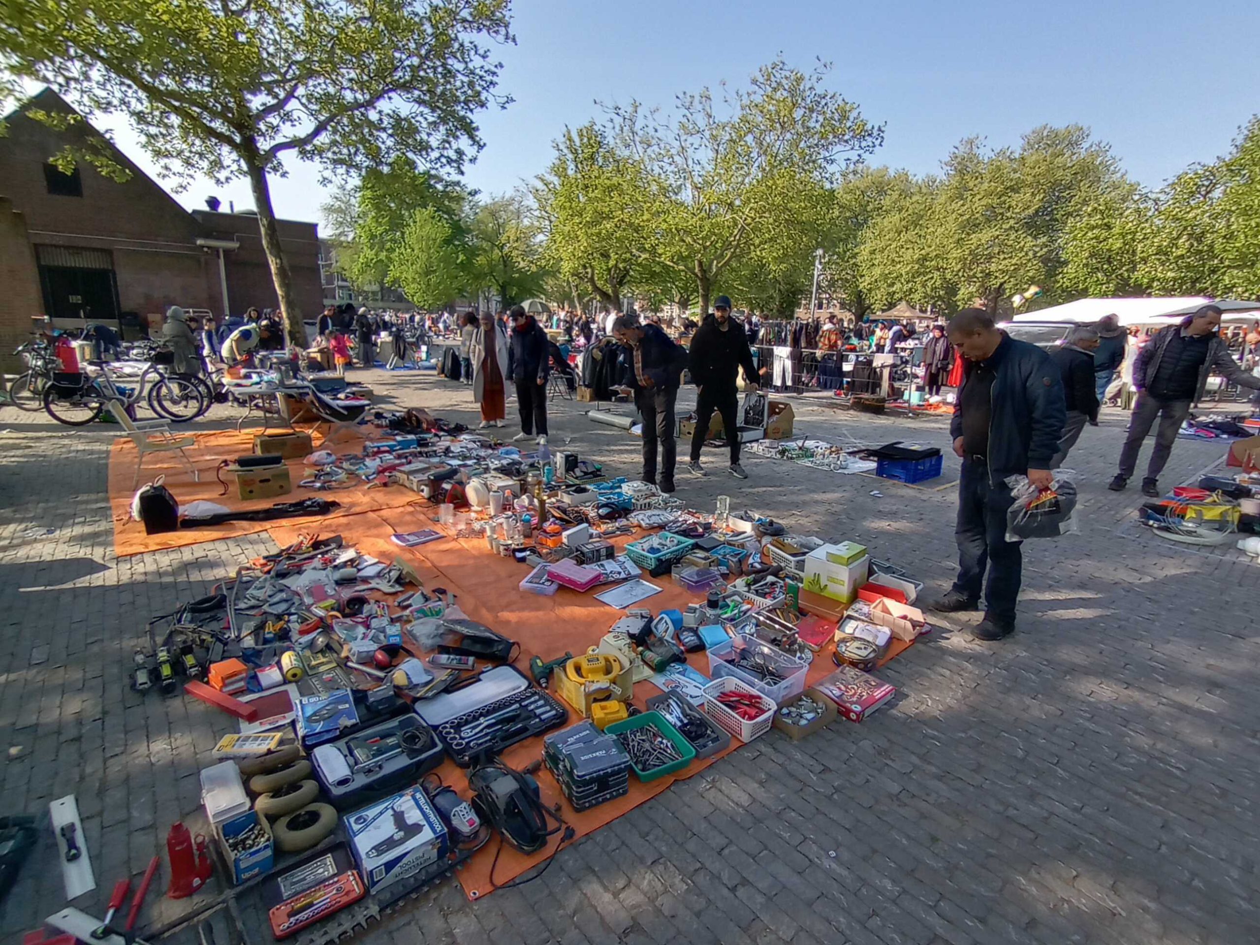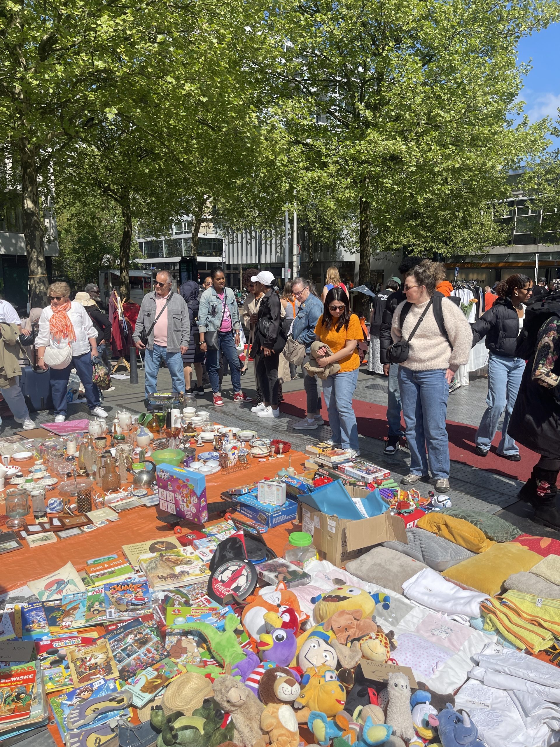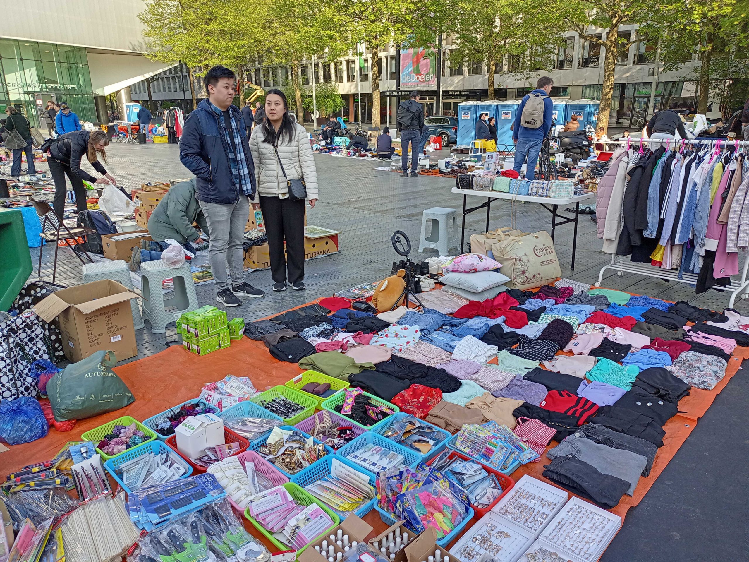 Ook op het Schouwburgplein en het Heemraadsplein is het al vroeg gezellig. De vele kleurrijke kleedjes en kraampjes trekken veel publiek.