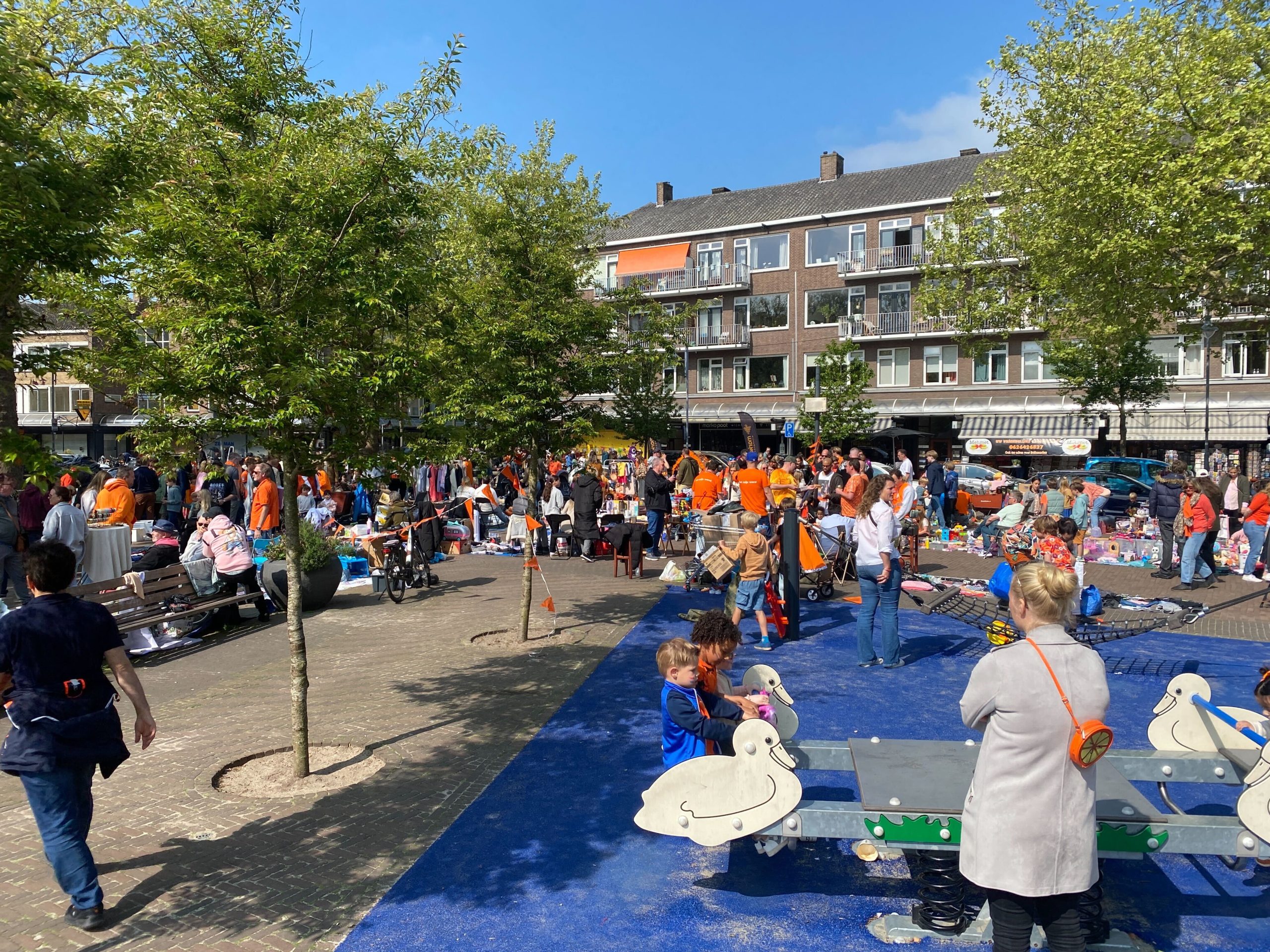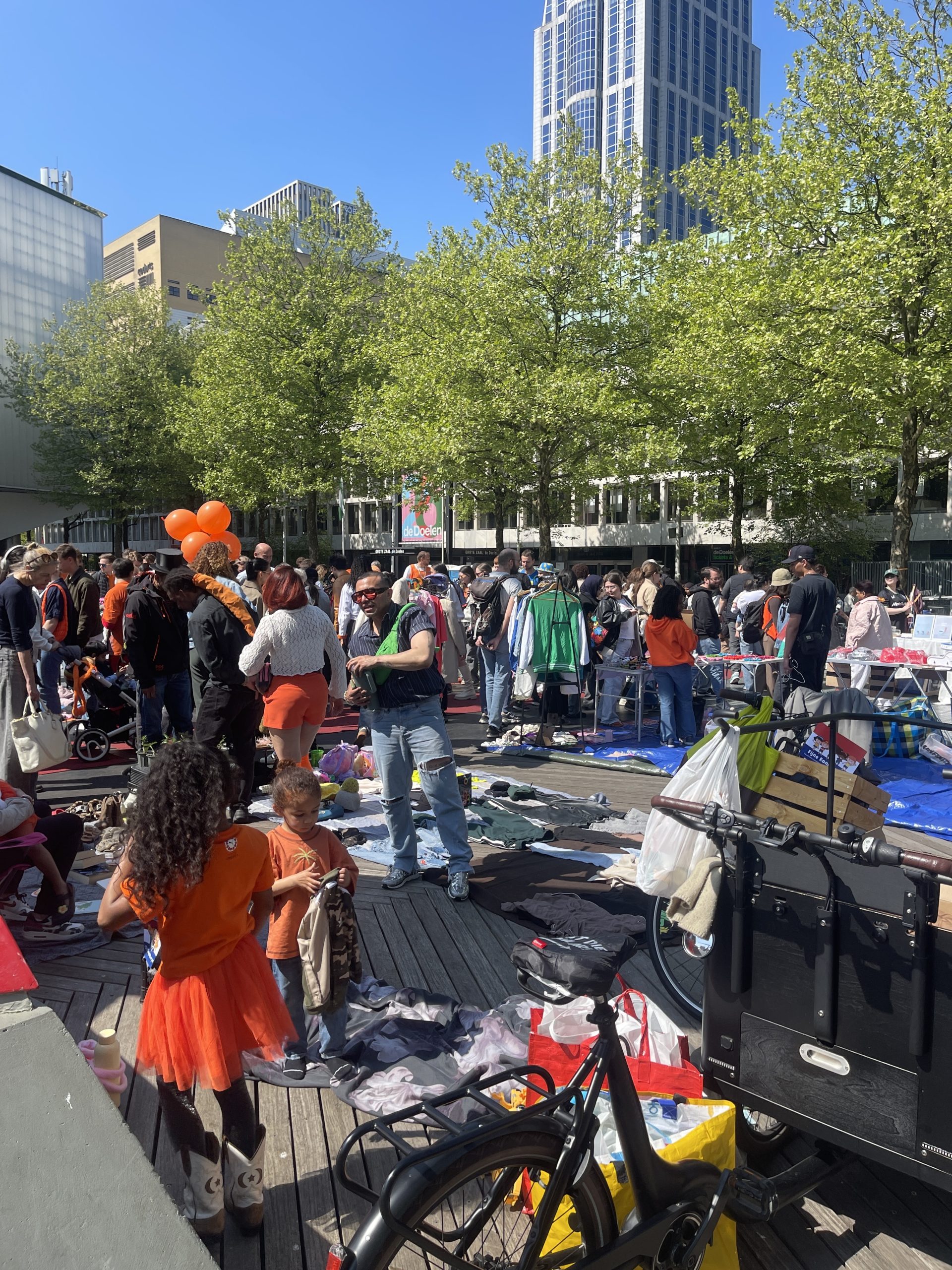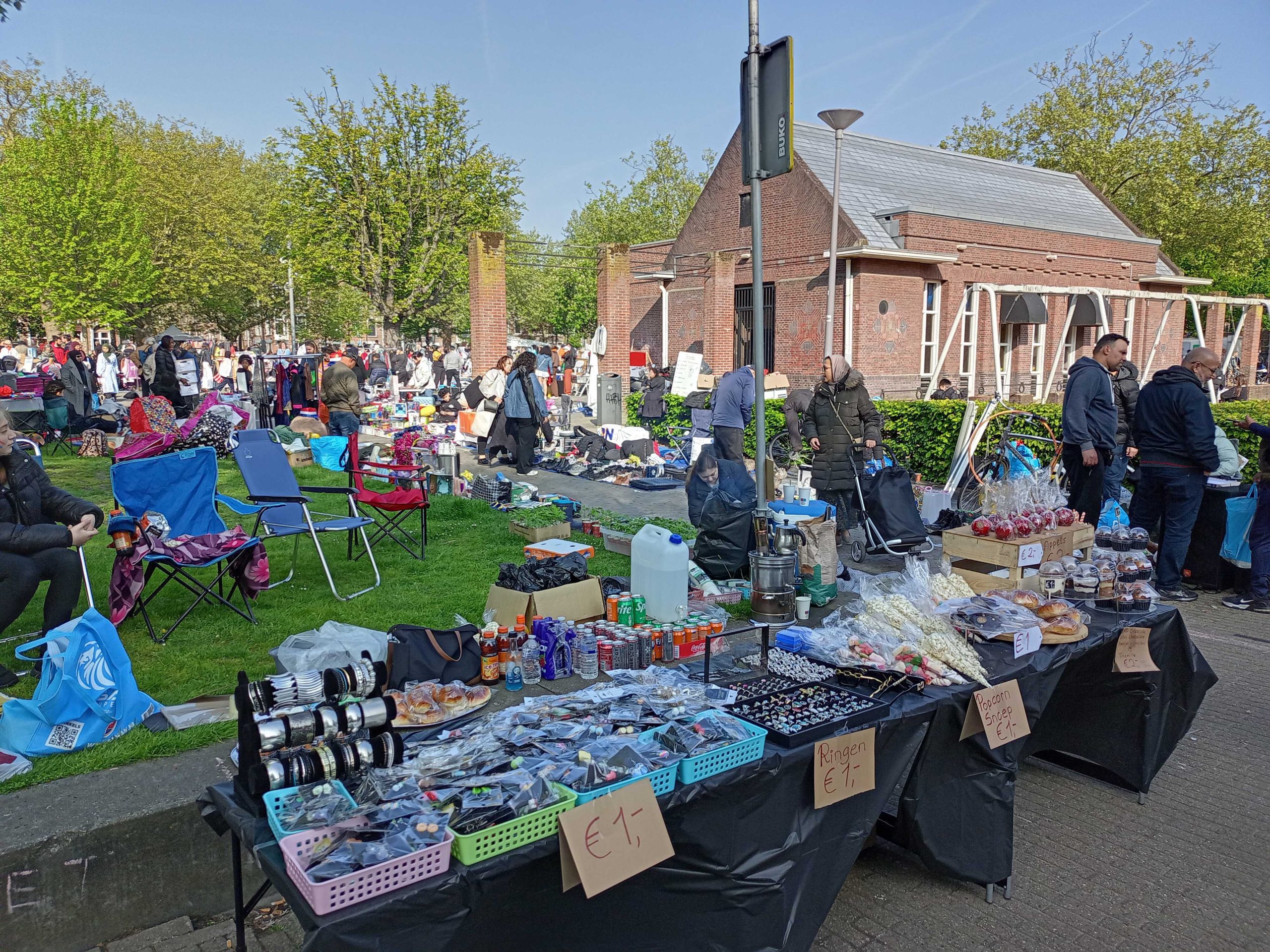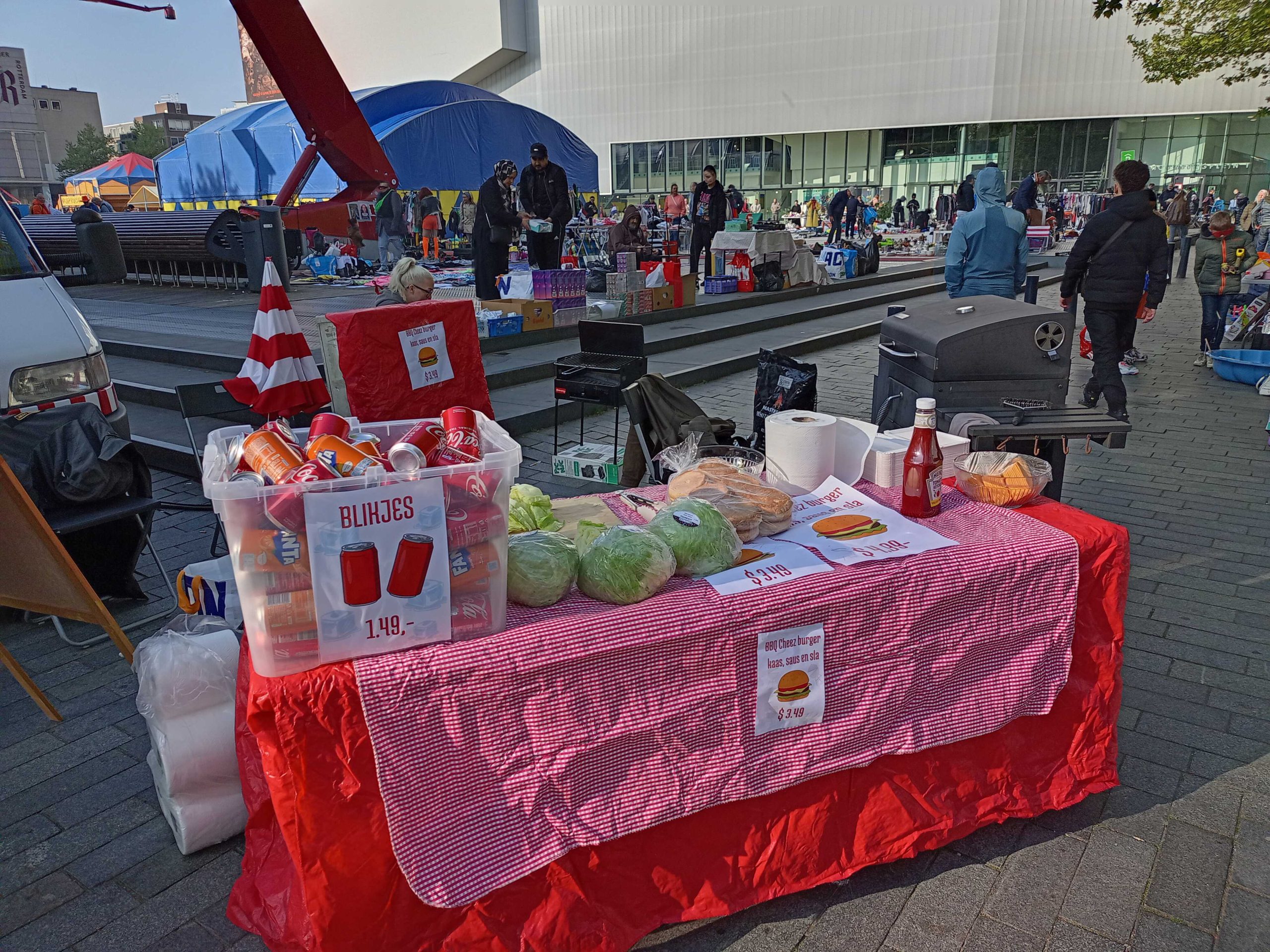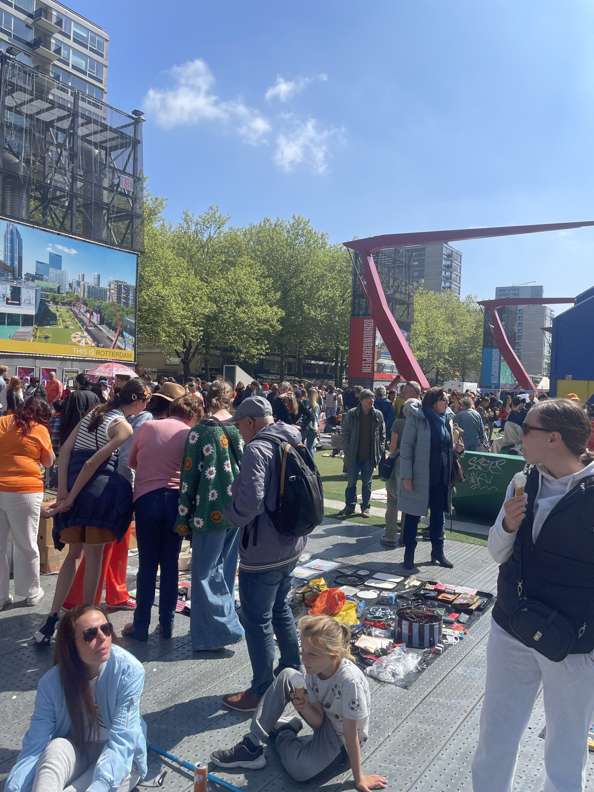 Ook op het Schouwburgplein en het Heemraadsplein is het al vroeg gezellig. De vele kleurrijke kleedjes en kraampjes trekken veel publiek.