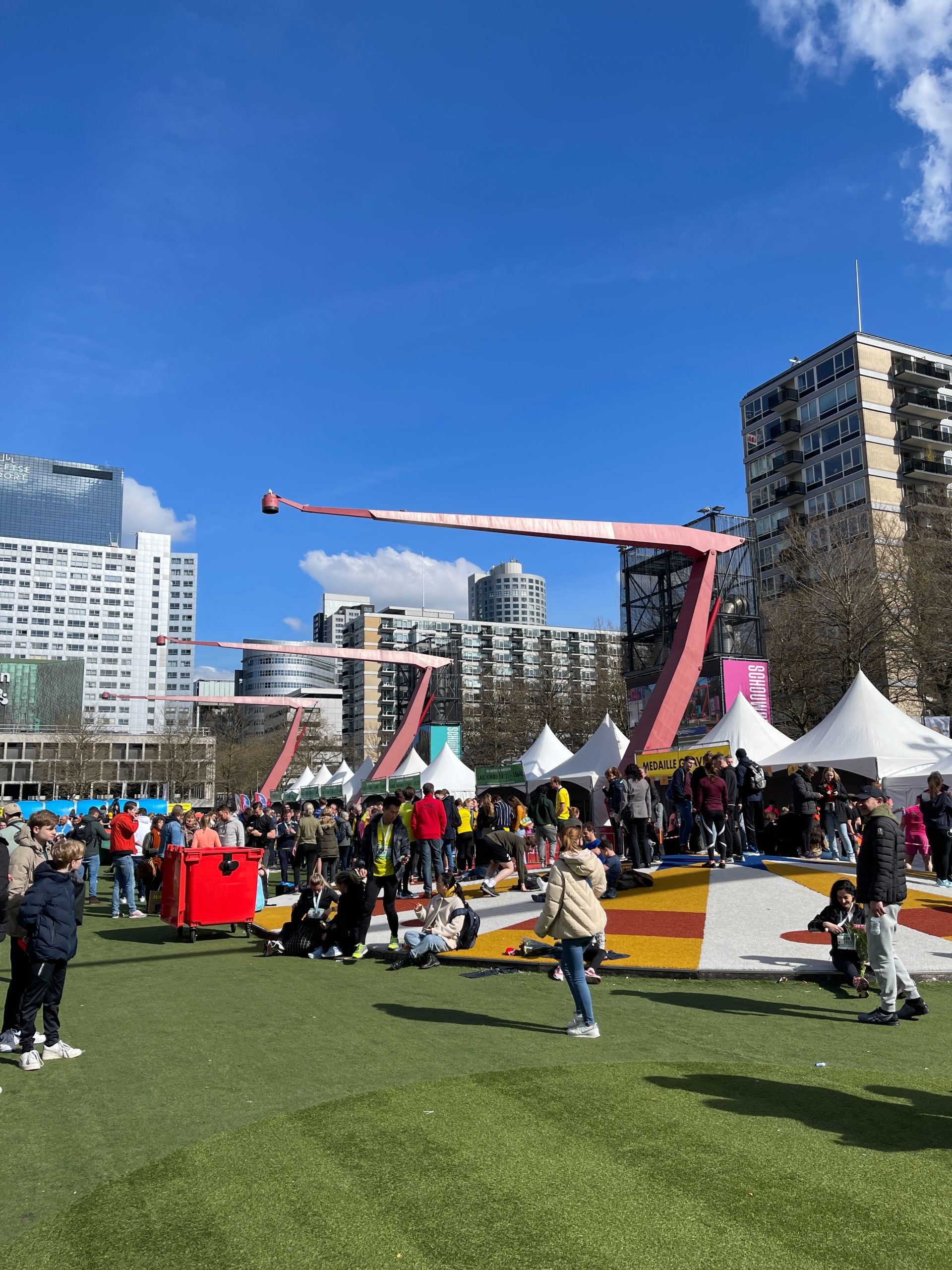 Het begint al vol te worden op het Schouwburgplein. Daar kunnen deelnemers hun medailles laten graveren. De deelnemers van de 1/4 Marathon Rotterdam hebben het parcours afgerond en stromen daar nu binnen.