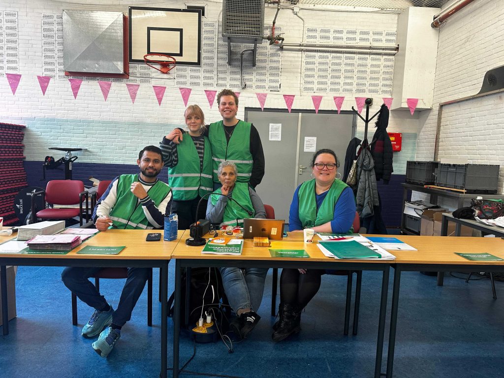 Bilal, Yente, Roy, Jeanette en Helena ontvangen vandaag de stemmers stembureau 623 in het Huis van de Wijk Carnisse.