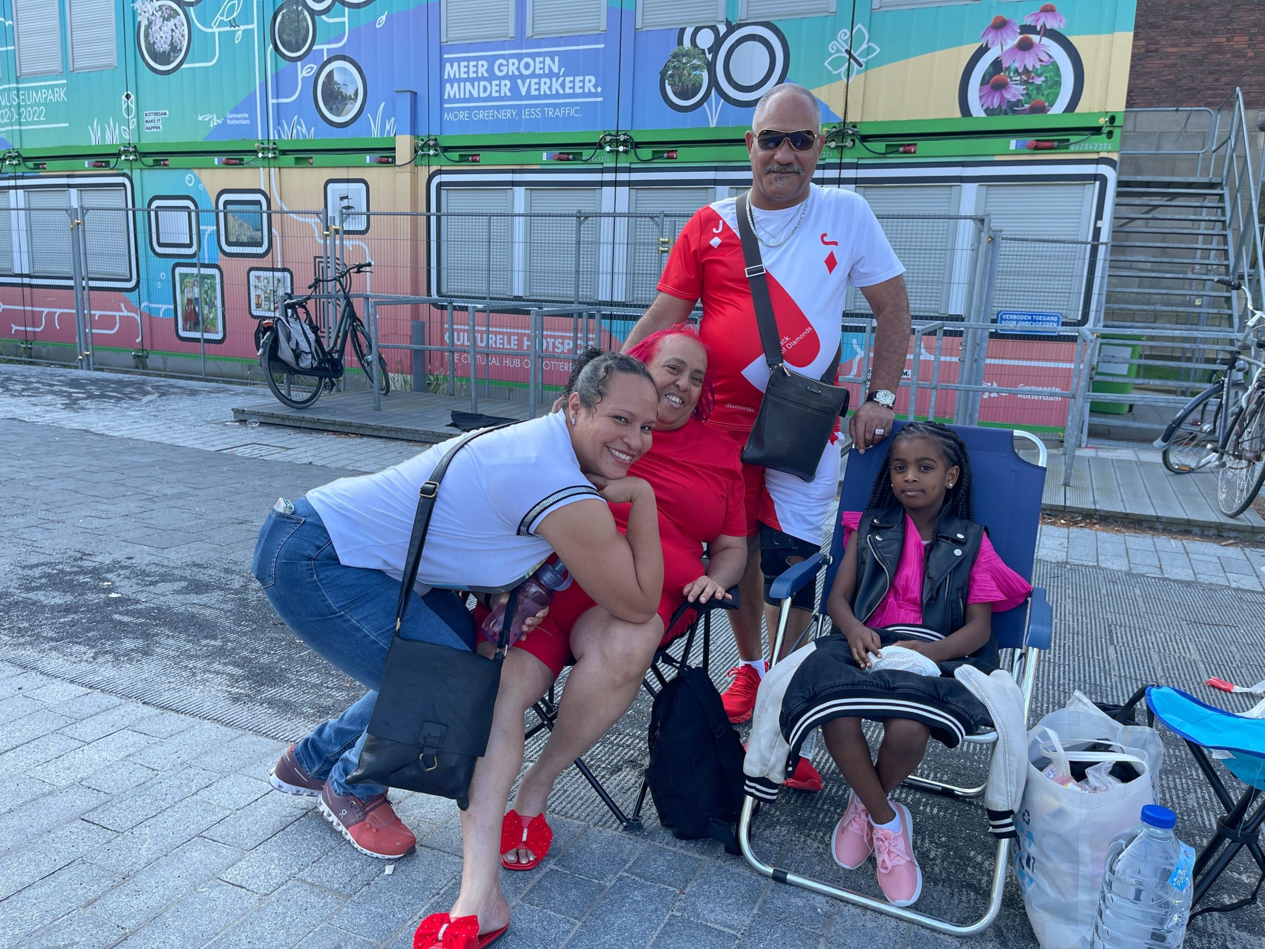 9.45 – Dit gezin op Museumplein is er vroeg bij. Zij zitten al klaar in afwachting van de Straatparade die over zo’n drie uurtjes voorbij komt. “We hebben hier een semi-familiebijeenkomst. Onze familie komt uit verschillende hoeken van Nederland naar ons toe en iedereen neemt wat lekkers mee. We maken er een gezellige dag van en moedigen onze familie aan.”