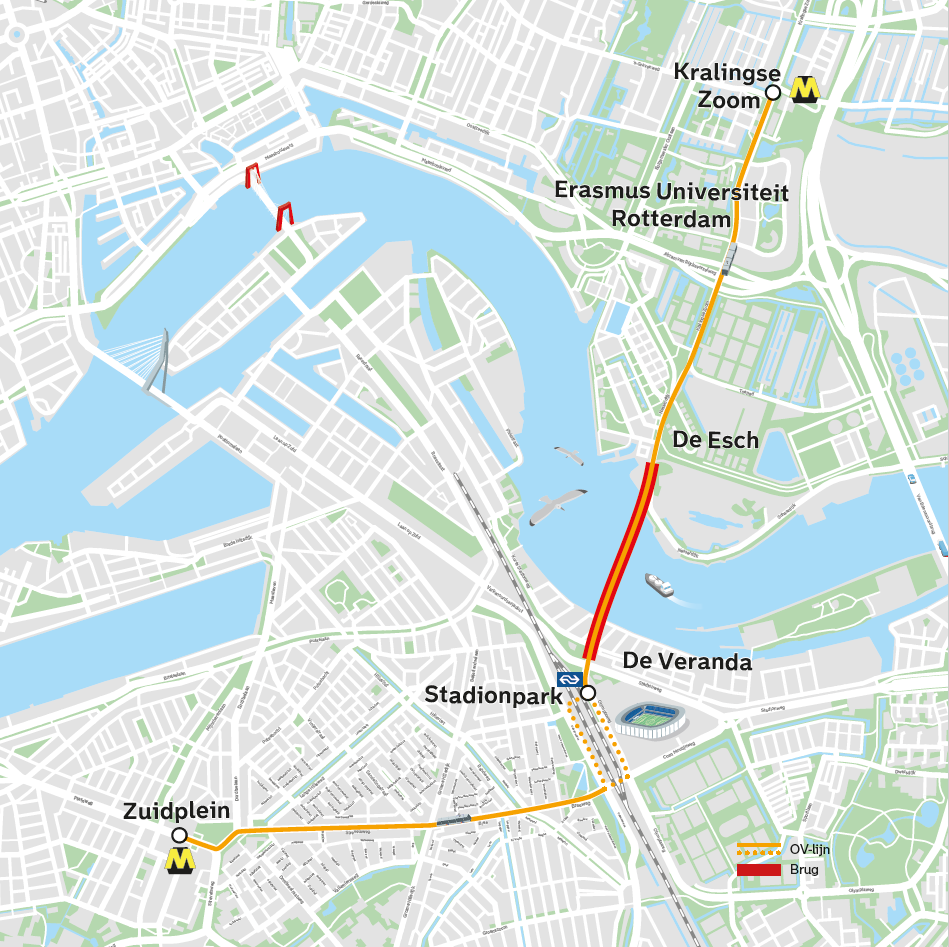Deze nieuwe tram krijgt een eigen snelle rijbaan, gaat over de nieuwe stadsbrug en langs het nieuwe treinstation Rotterdam Stadionpark naast De Kuip.