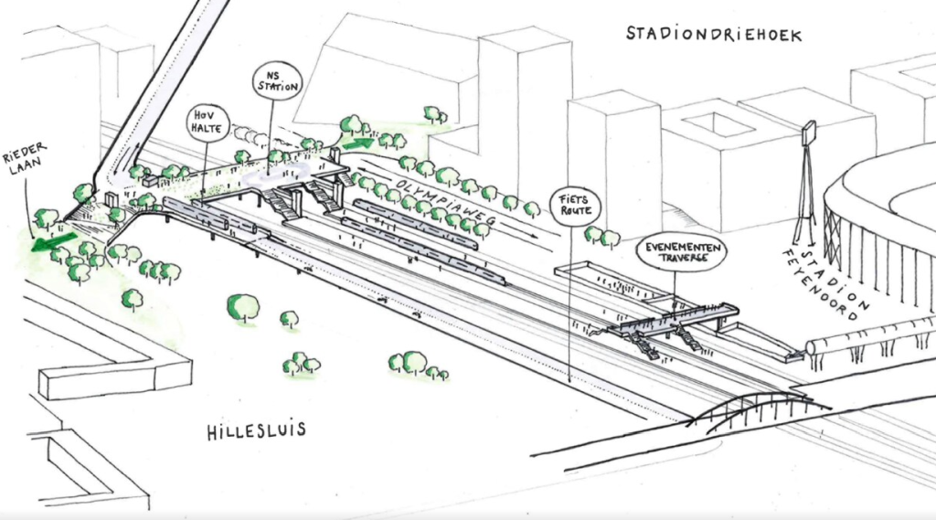 Er komt een nieuwe loopbrug over het spoor tussen De Veranda en Hillesluis, die ook toegang geeft tot de perrons. Met een nieuwe loopbrug over het spoor kunt u straks ook eenvoudig naar het nieuwe Getijdenpark aan de Maas. Daarnaast worden een tramviaduct en een aparte loopbrug voor evenementen in De Kuip gerealiseerd.