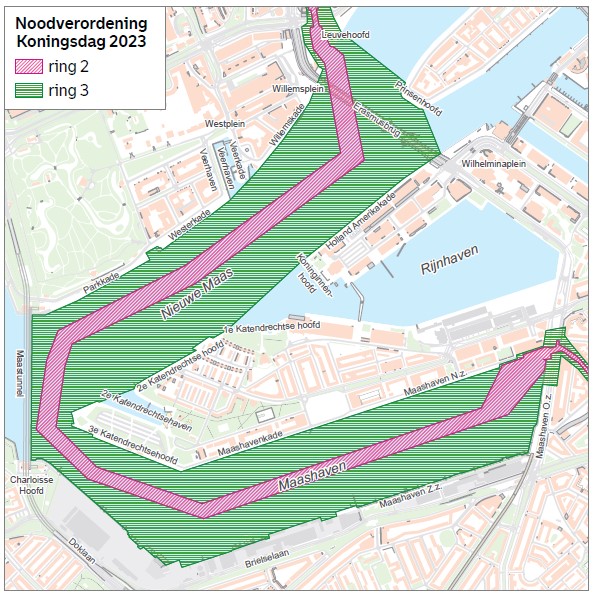 De noodverordening is opgesteld om Koningsdag veilig te laten verlopen. Zo is bijvoorbeeld de wandelroute van de koninklijke familie afgezet met dranghekken en zijn er verschillende wegafsluitingen (zie onderaan dit bericht). Het is daarom ook niet mogelijk om te parkeren op bijvoorbeeld het Afrikaanderplein. Omdat de Koninklijke familie over de Maas naar de Leuvehaven wordt gebracht, is ook de Erasmusbrug afgesloten en geldt er een vaarverbod tussen 08:00 tot 12:30 uur. Verder is het vliegen met drones in de gehele stad niet toegestaan.