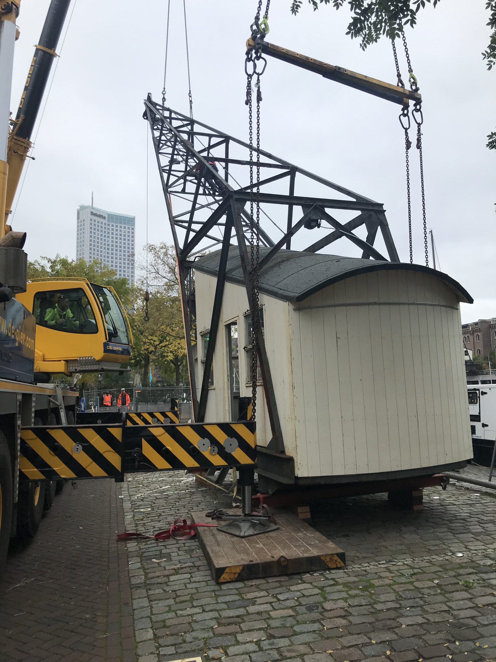 Het gaat om de kraan tegenover pakhuis De Vijf Werelddelen. Samen met het gebouw en drie andere kranen vormt deze kraan een Rijksmonument. Om de werkzaamheden goed uit te kunnen voeren, is het volledige bovendeel van de kraan gedemonteerd en naar de kade getakeld. Dat gebeurde woensdag 10 november met behulp van twee nóg grotere kranen.