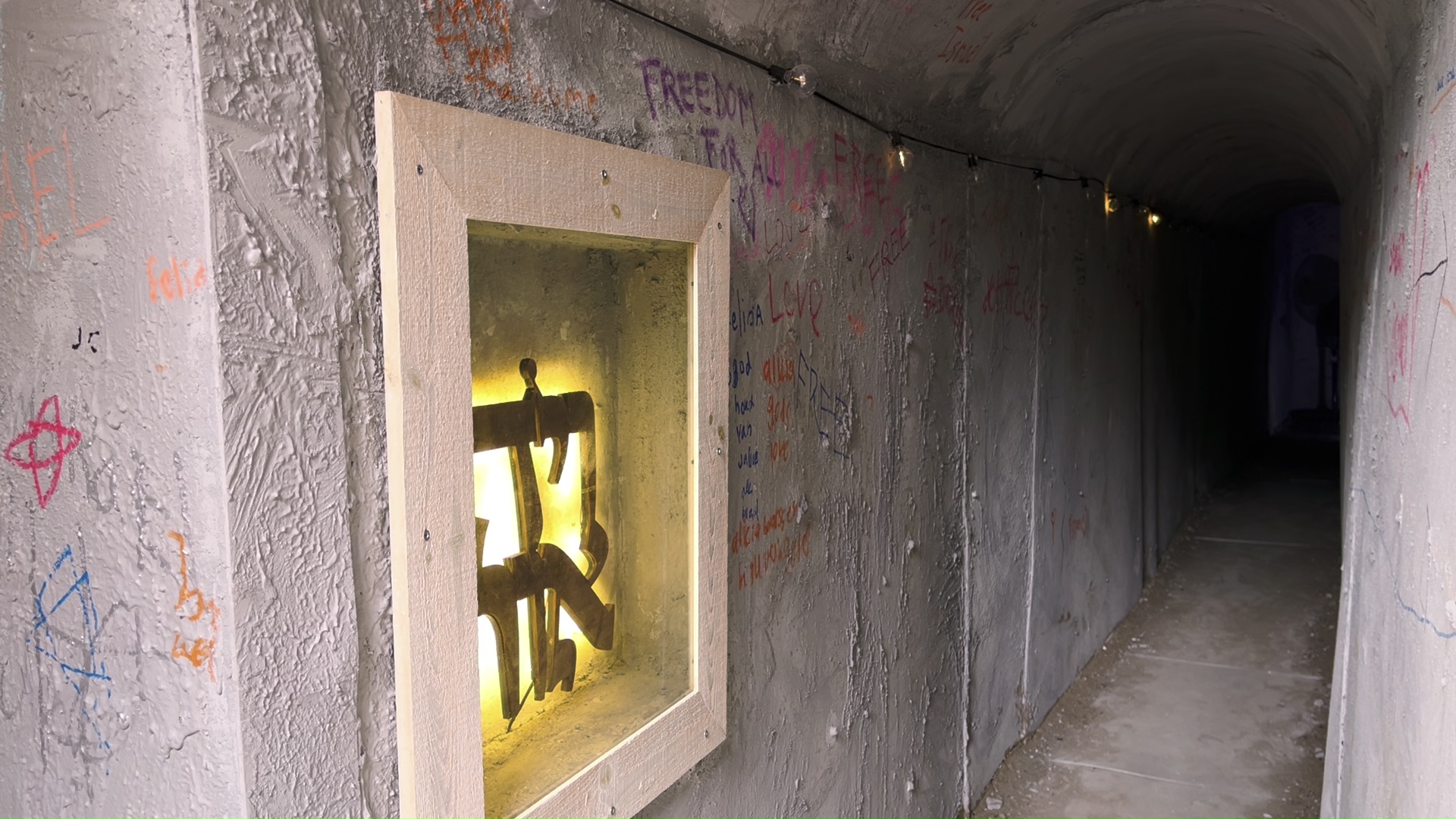 Hoe is het om gegijzeld te worden? Of hoe voelt het als een dierbare van je gegijzeld wordt? Dat zijn de vragen die Israëlisch-Nederlandse kunstenaar Rachel Meijler stelt met haar werk ‘De tunnel’. Het is een replica van een Hamas-tunnel, van 24 meter lang. Wie erdoorheen loopt, hoort geluidseffecten van bombardementen en voelt de grond trillen. Het werk maakte ze nadat een familielid van Meijler gegijzeld werd, en later vermoord.