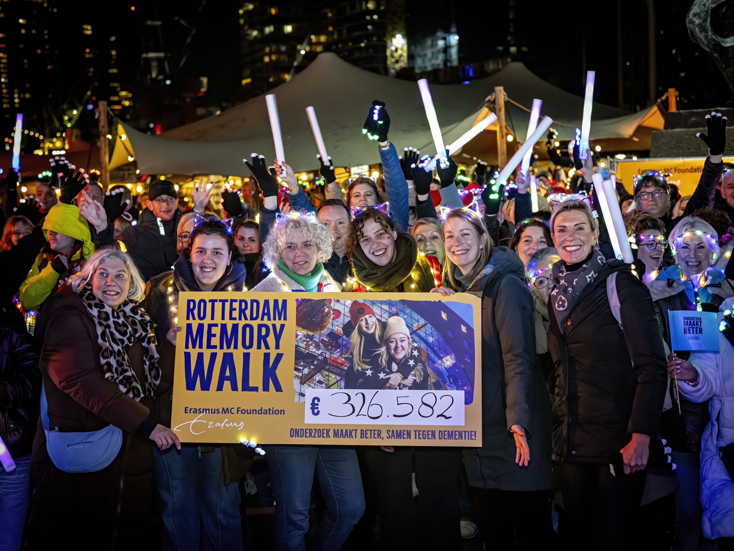 De Rotterdam Memory Walk, een wandeling om geld in te zamelen voor dementieonderzoek, heeft dit jaar een recordbedrag opgehaald. Tijdens de vijfde editie van het evenement, zaterdag 13 december op Plein 1940, werd 326.582 euro ingezameld. Inmiddels is dat bedrag verder opgelopen tot 329.590 euro.