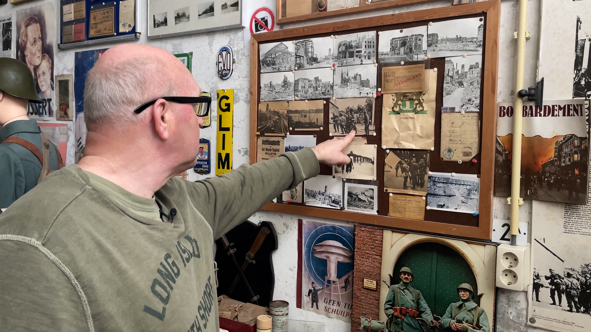 “Ik wist dat ik ‘m had”, roept Jan als hij met een klein fotoboekje tevoorschijn komt. De foto’s laten een Rotterdam voor en na het bombardement zien. “Toen van die ouwe kerel gehad”, vertelt Jan aan zijn medeverzamelaar die ook op bezoek is. “We raakten aan de praat en toen vertelde hij dat hij nog een boek over het bombardement had liggen. Hij zei: ‘Neem maar mee’.” En dit is het niet enige. Ook aan de muur en in allerlei archieflaatjes liggen nog meer foto’s van een verwoest Rotterdam.