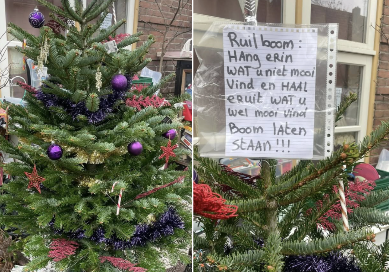 Caroline heeft weggeefkasten in haar tuin, maar dit jaar heeft ze een nieuwe toevoeging: een ruilkerstboom. Buurtbewoners die hun kerstversiering zat zijn, mogen hier alles in hangen én iets nieuws meenemen.
