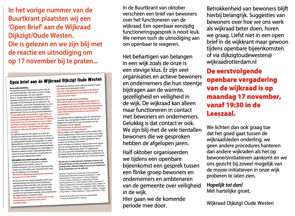 “Wij maken ons grote zorgen over het functioneren van onze wijkraad,” staat in de Buurtkrant van Dijkzigt Oude Westen in oktober 2025. Een groep wijkbewoners heeft samen een open brief aan de wijkraad geschreven. De toon van de brief is hard. Volgens de schrijvers doen de wijkraadsleden vooral wat ze zelf willen en hebben ze weinig goed contact met de buurt. In de afgelopen vier jaar zijn er al drie wijkraadsleden opgestapt. De zittende wijkraad vindt het vervelend om te horen dat er klachten zijn, maar herkent zich er tegelijkertijd niet in. “De wijkraad kan alleen maar functioneren in contact met bewoners en ondernemers”, reageert ze in de november-editie van de krant. “Gelukkig is dat contact er ook.” Ondertussen is er aan beide kanten nog steeds spanning en frustratie.