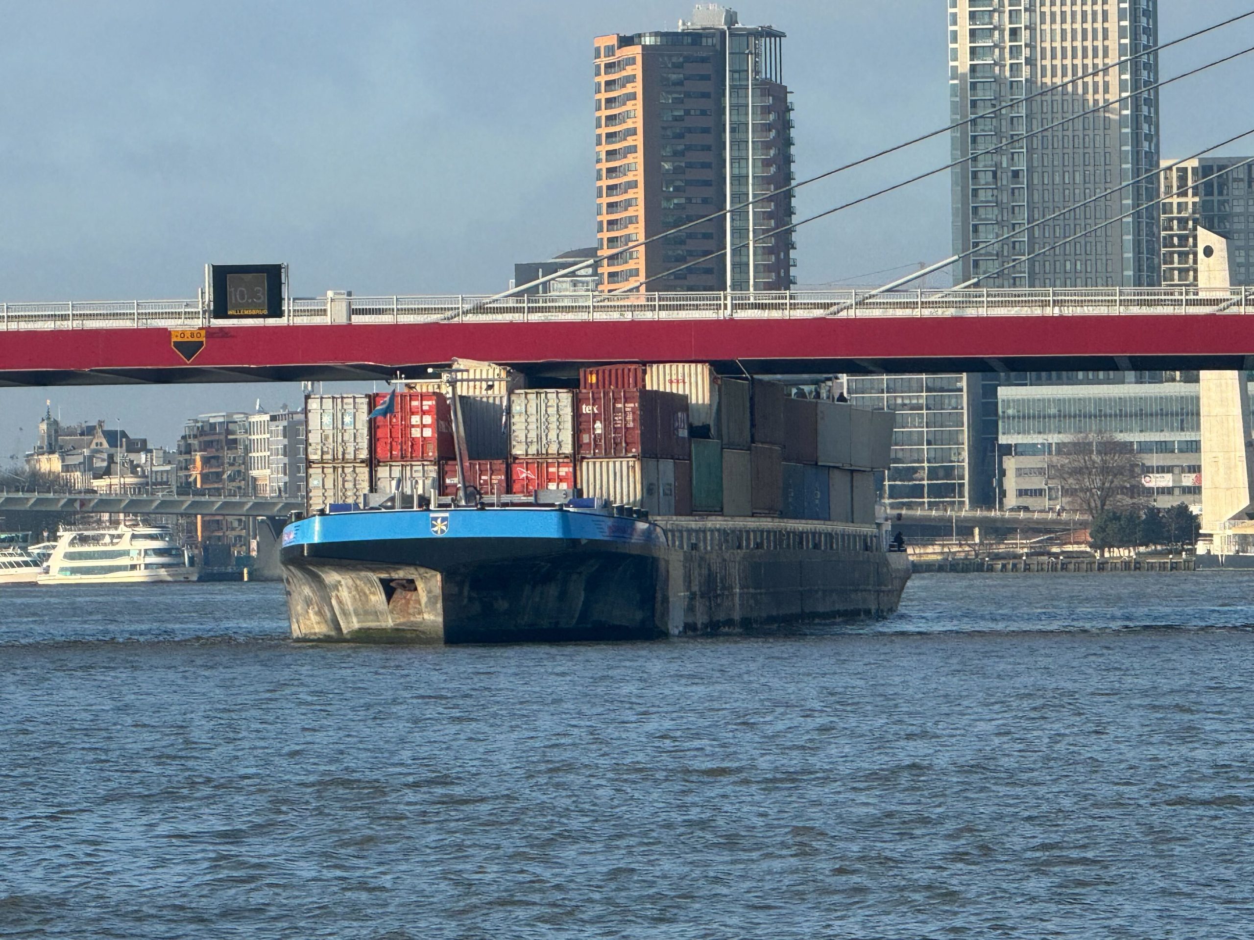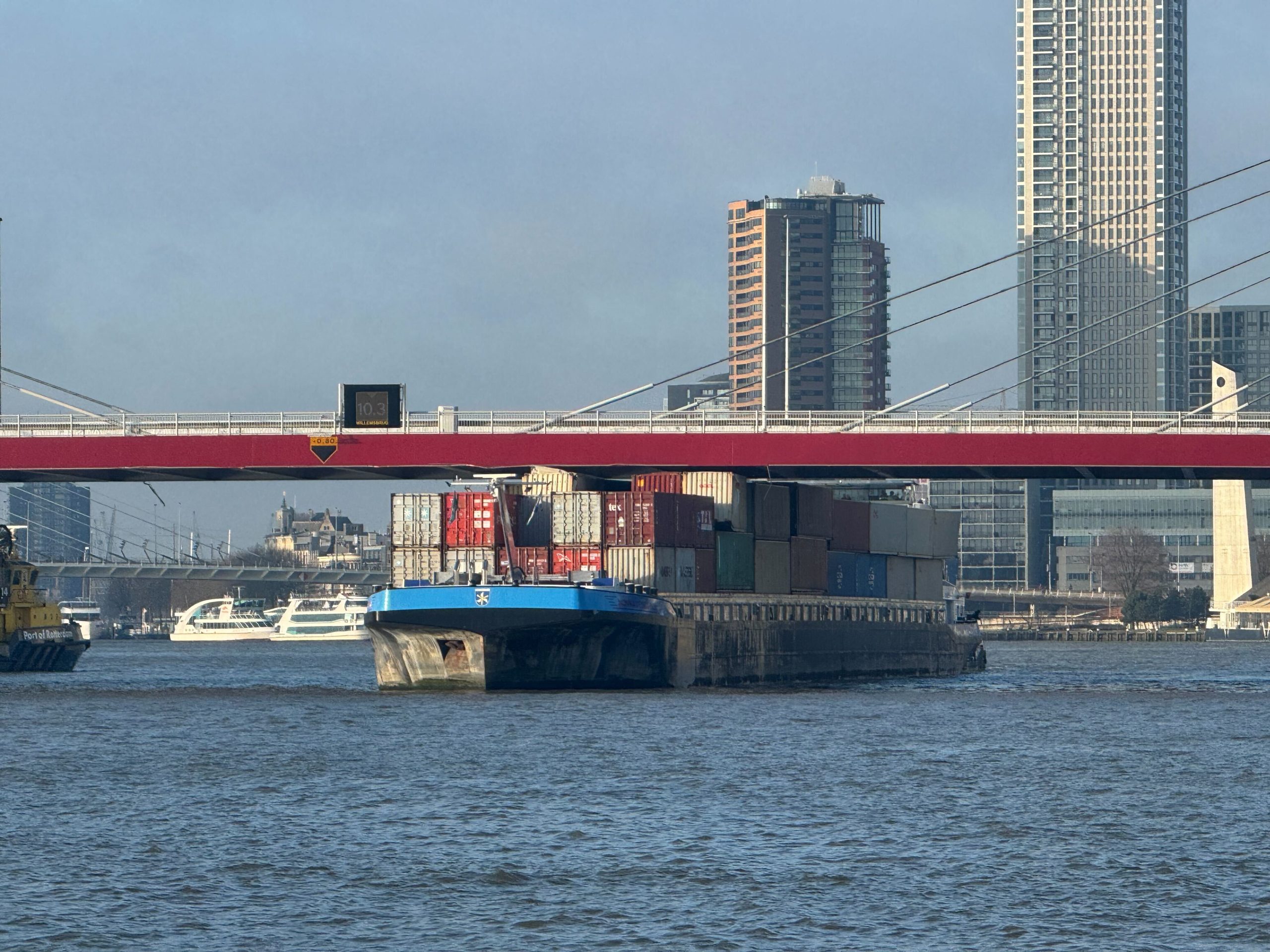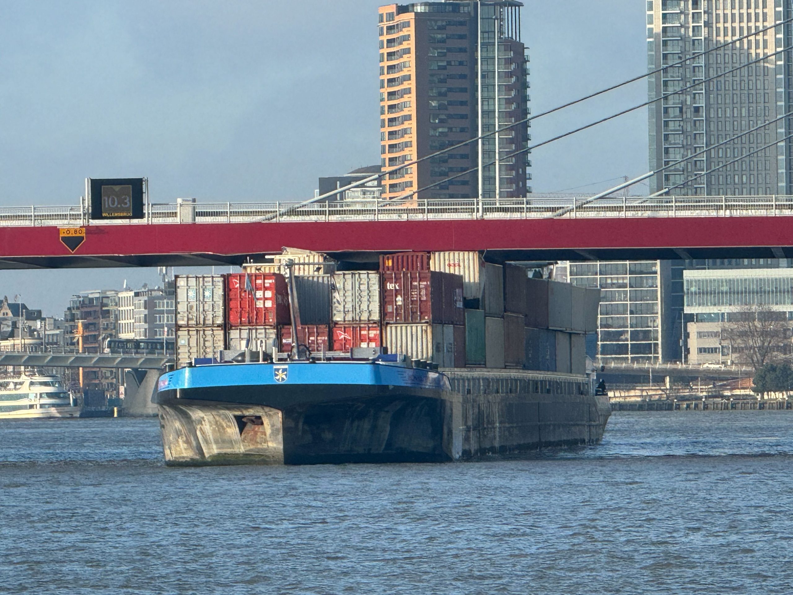 Vrijdagochtend rond half 8 is er een binnenvaartschip tegen de Willemsbrug gevaren. Het schip kwam vast te liggen en er is een container in het water gevallen. De hulpdiensten zijn ter plaatse en de brug is afgesloten. Het is nog onduidelijk hoe lang het gaat duren om het schip weer los te krijgen.