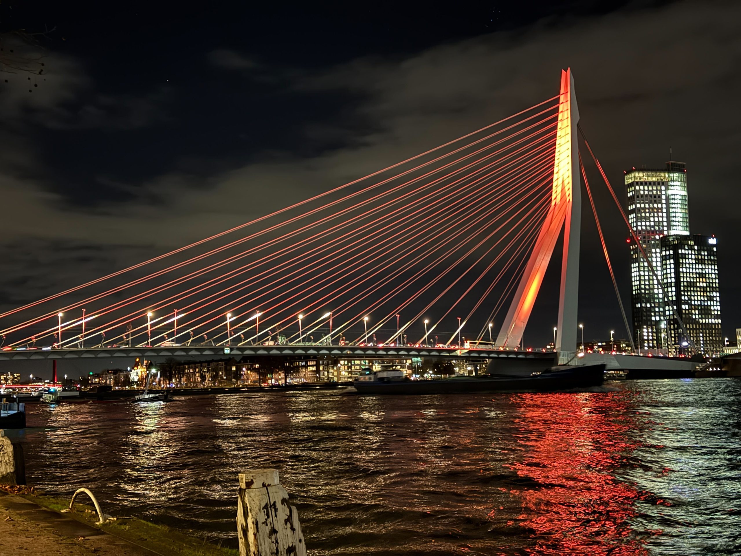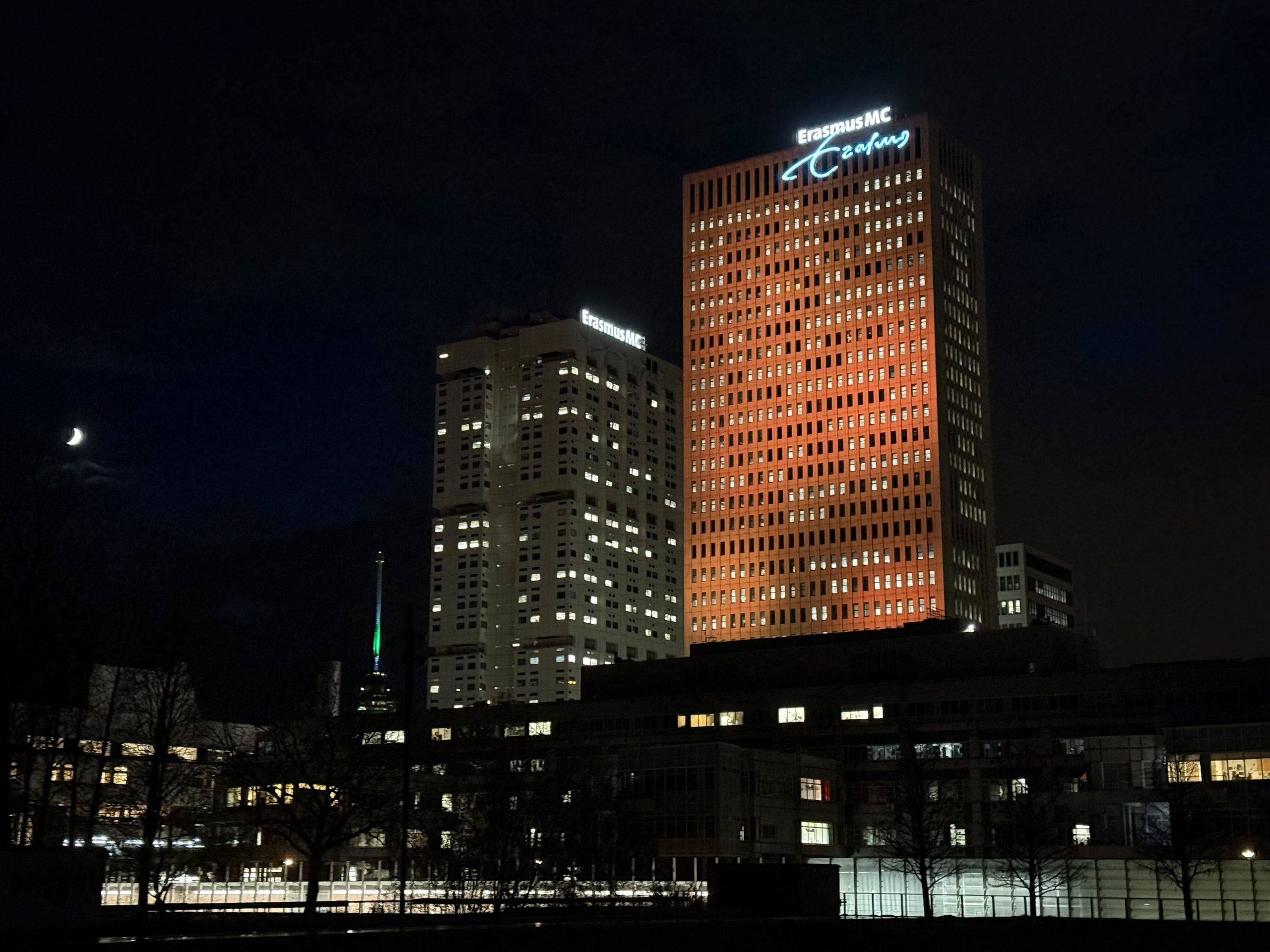 Locaties zoals de Euromast, de Erasmusbrug, het Stadhuis, de Laurenskerk en het KPN-gebouw zijn na zonsondergang (16.40 uur) in oranje kleur te zien.