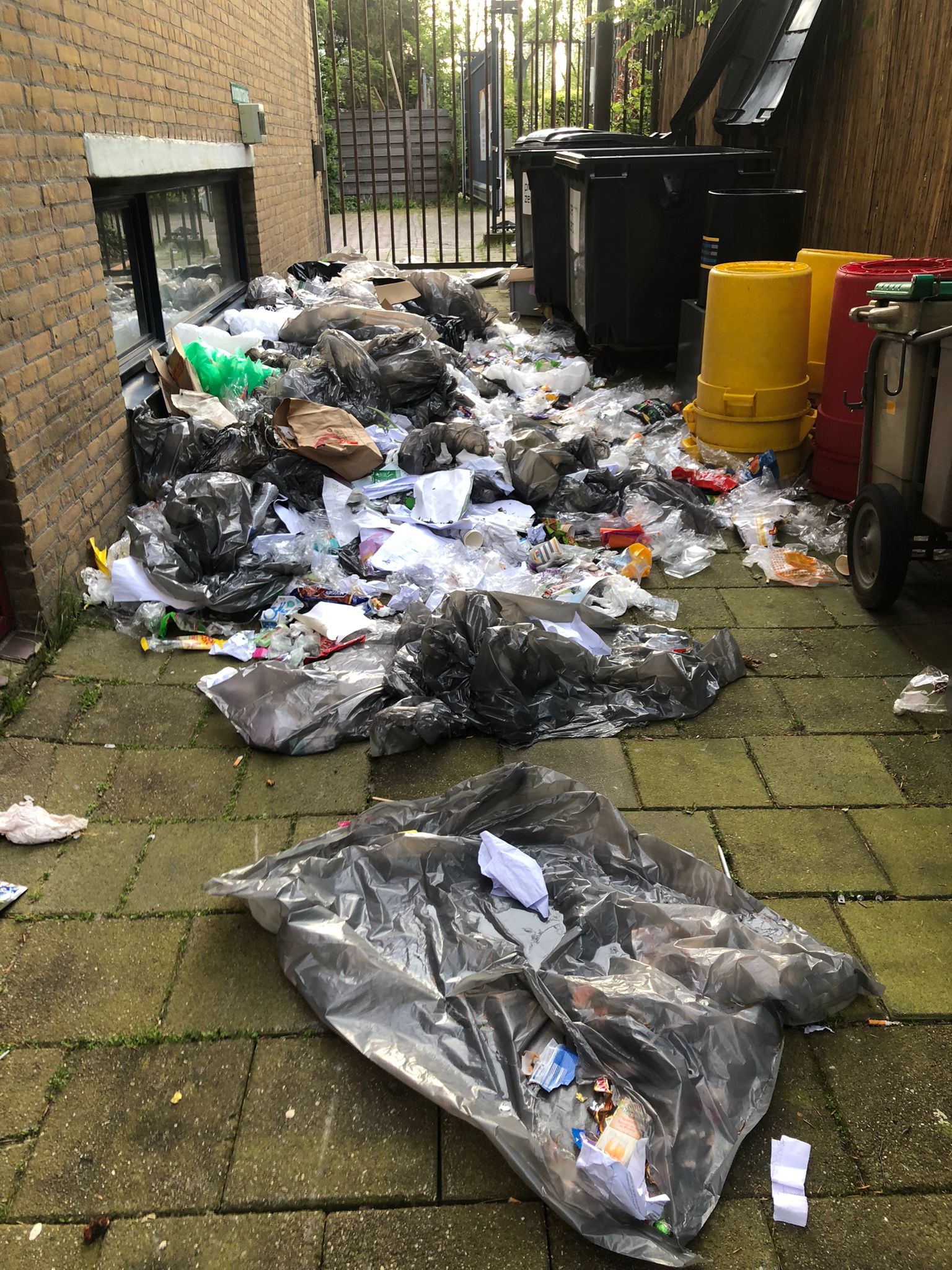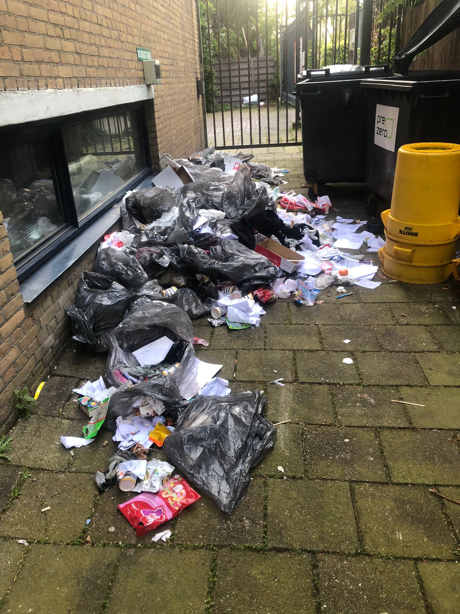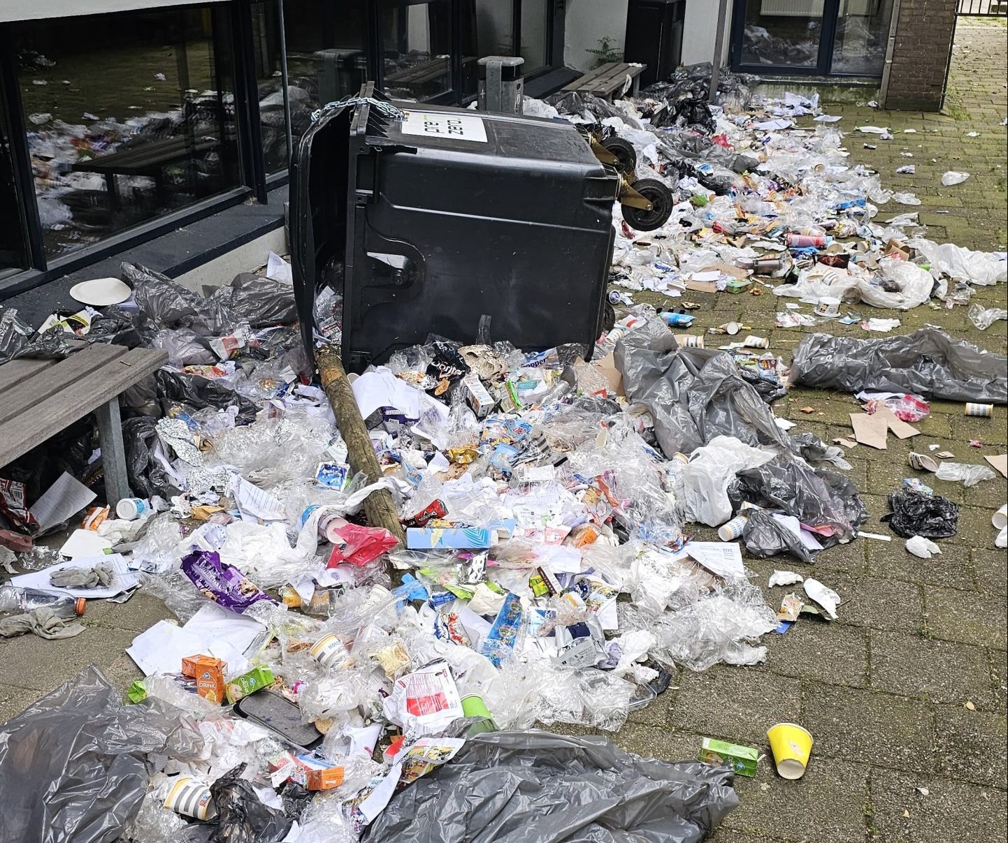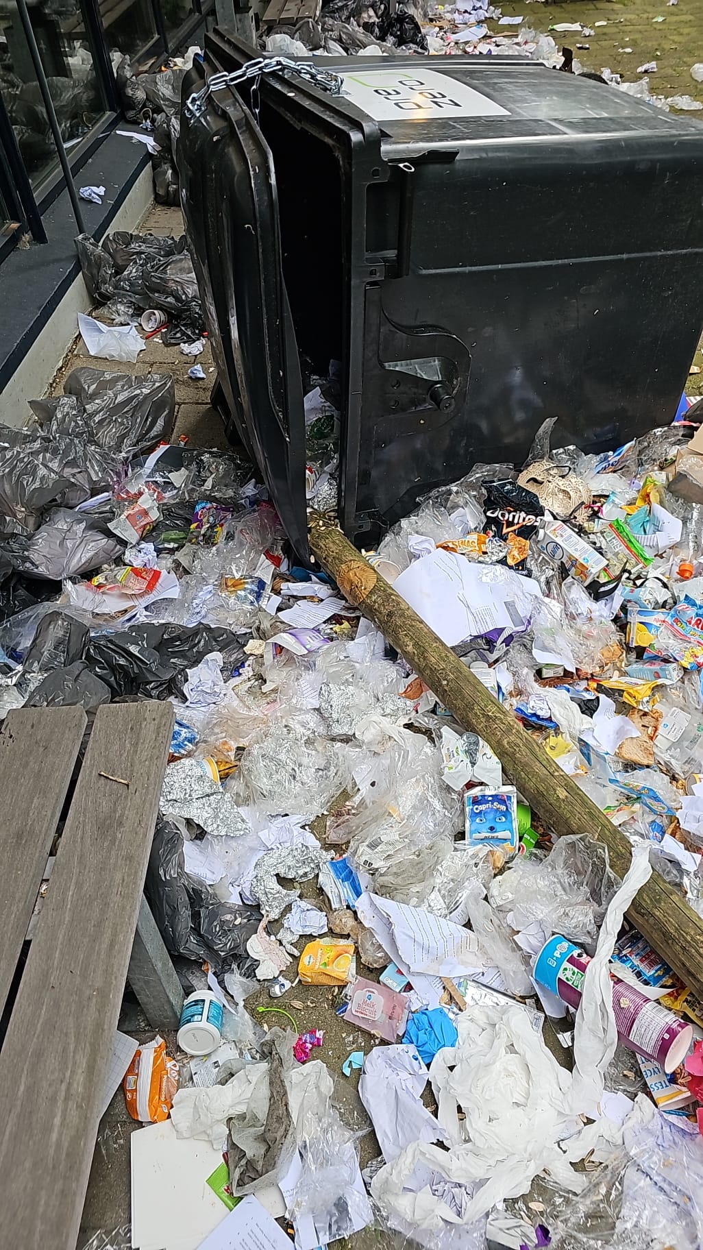 Pieter heeft op advies van PreZero, een Rotterdams afvalverwerkingsbedrijf, na de vierde keer sloten op de prullenbakken gemonteerd. Toch zijn de containers in de laatste vijf weken elke week minstens een keer leeggehaald. Dit gebeurt volgens Pieter vaak in het weekend of tijdens vakanties. “Als ik dan weer aankom op school, is het een en al ellende.” De eerste uren na het weekend besteedt Pieter dan ook aan het opruimen van het afval.