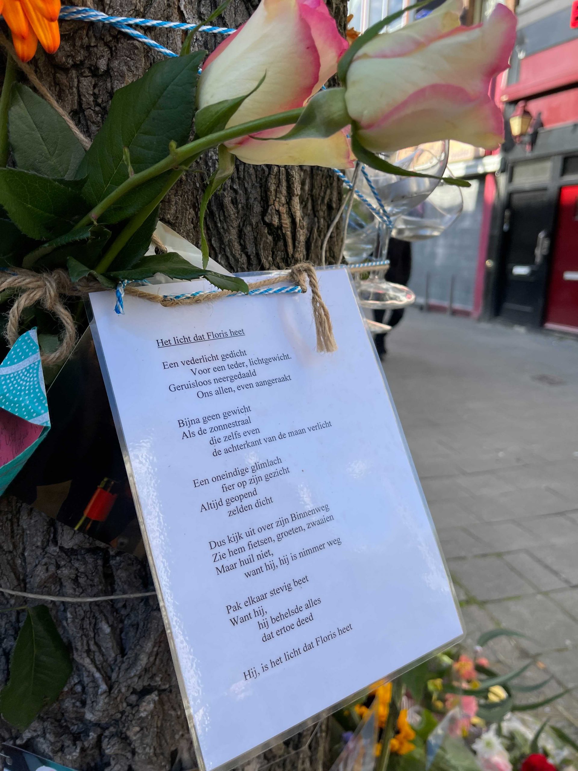 Op de boom waar de bloemen zijn neergelegd kun je ook foto’s zien van Floris met zijn vrienden, foto’s uit zijn jeugd, blikjes, flessen en kaarsjes. Er is een mooi gedicht toegewijd aan Floris die in de boom hangt, waarin staat: ‘Hij, is het licht dat Floris heet’.