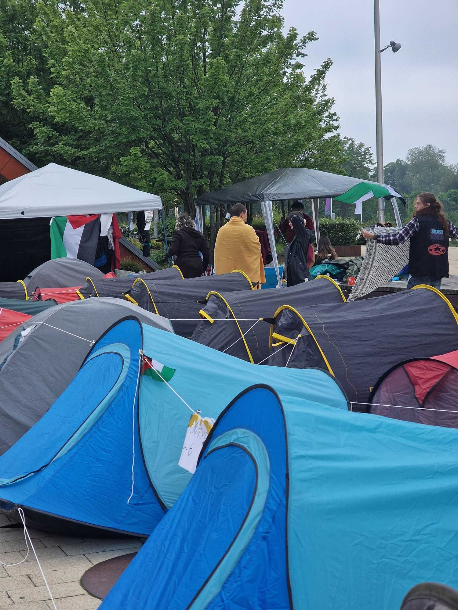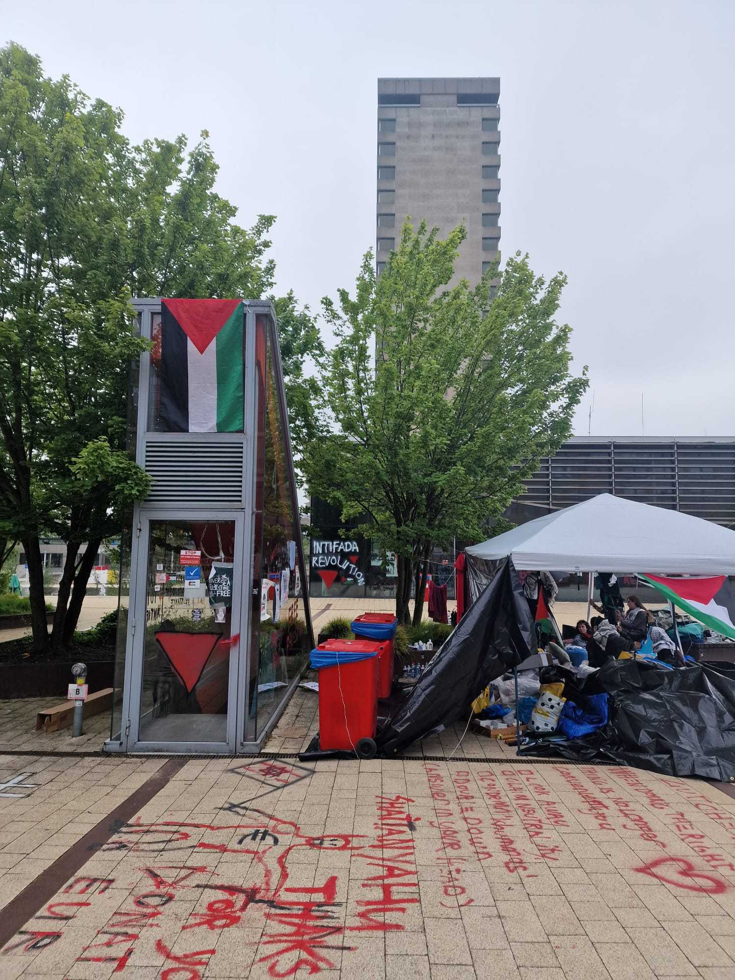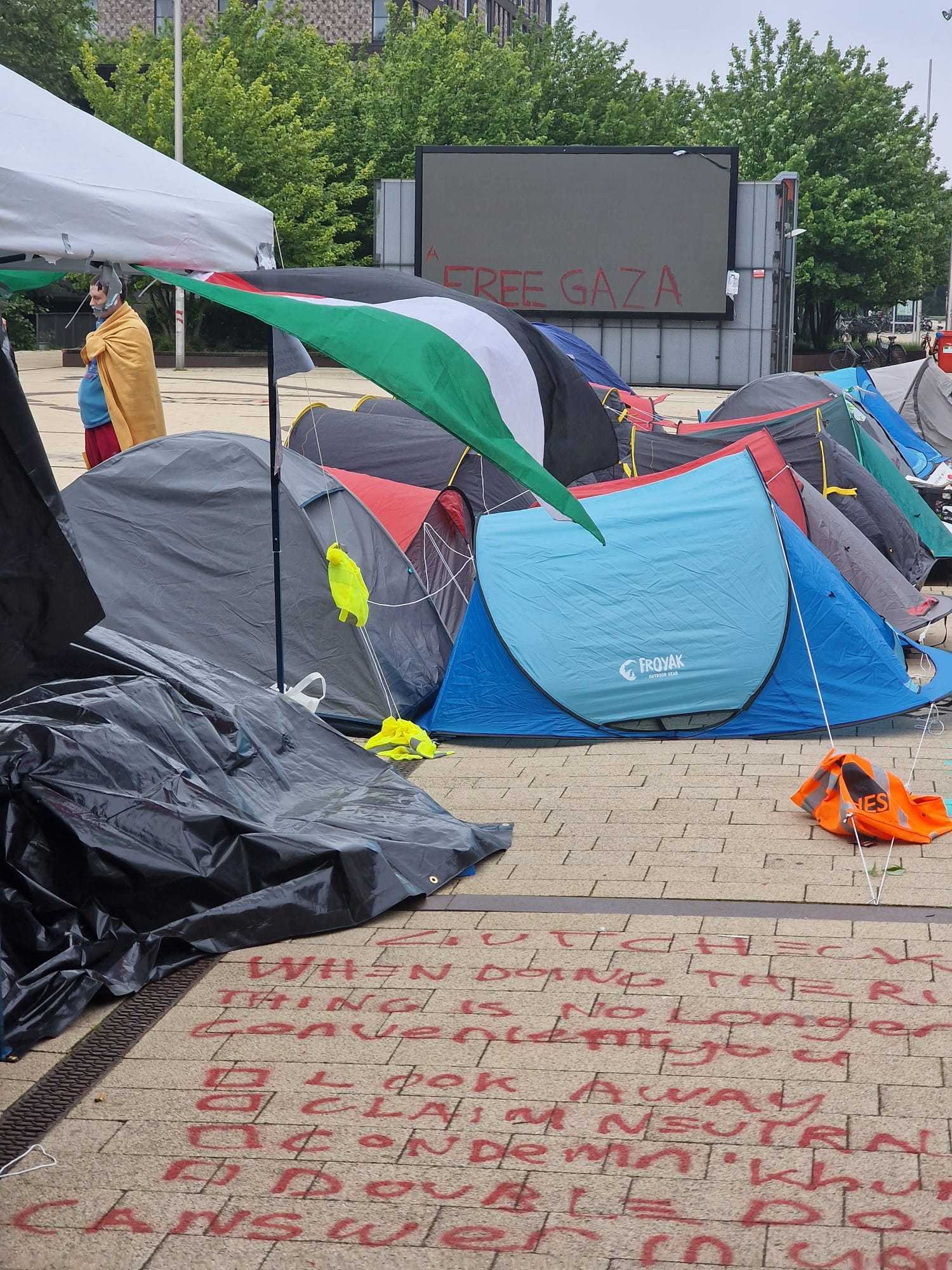 Sinds donderdagmiddag zijn de studenten van de Erasmus Universiteit aan het protesteren op de campus. Ze verblijven in een tentenkamp waar ze onder andere banners maken. Vandaag verspreiden de studenten hun boodschap over de gebouwen met verf.