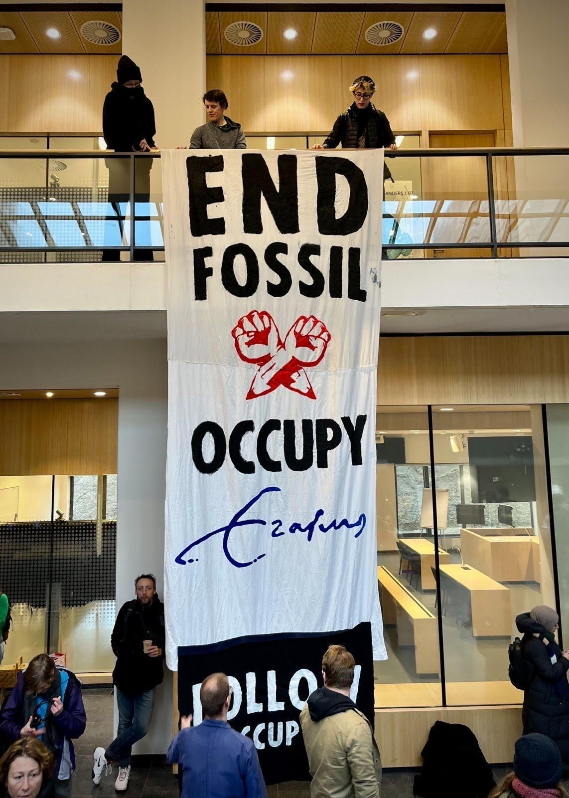 Studentenleden van Occupy Eur bezetten het Sanders gebouw van de Erasmus Universiteit om zo aandacht te trekken voor de klimaatcrisis. Het is een vreedzaam demonstratie tegen de fossiele industrie. Als het aan de demonstranten ligt blijven ze zitten tot ze worden weggestuurd. De slaapzakken zijn in ieder geval mee.