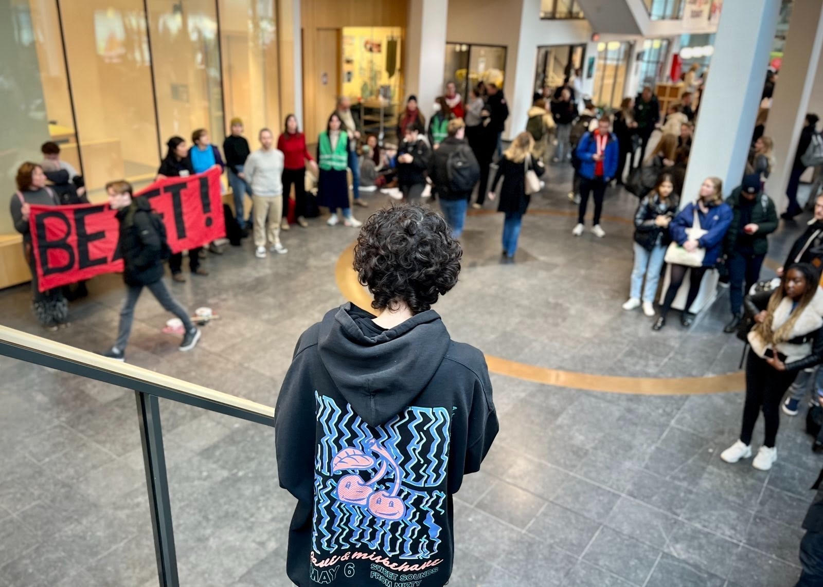 De studenten zitten gezamenlijk binnen in het gebouw. De politie omsingelt het gebouw en alleen studenten met een studentenkaart mogen het gebouw betreden. Wij spreken een van de demonstranten van Occupy EUR hij vertelt dat de dag goed verloopt en dat de moed er goed in zit. “De groep actievoerders blijft groeien, we gaan hier niet weg voordat aan onze eisen is voldaan, dus zo nodig slapen we hier”, zo vertelt hij ons.