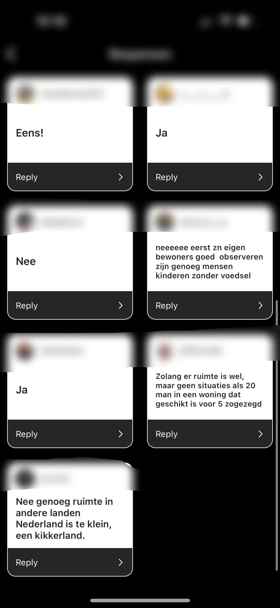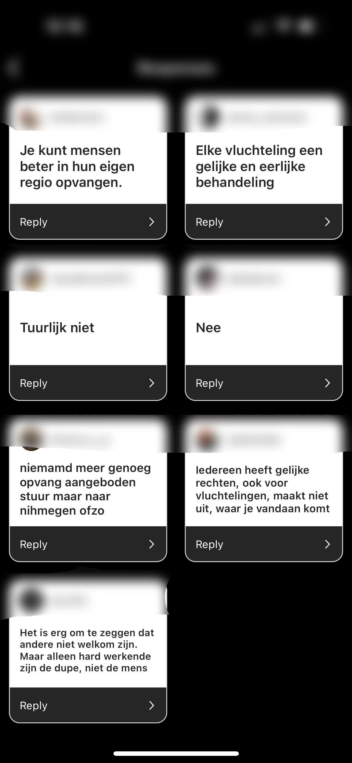 Via Instagram legden wij onze volgers een aantal stellingen en vragen voor over het Rotterdamse vluchtelingenbeleid. De stellingen waren: Rotterdam moet meer vluchtelingen opvangen, gemeenten mogen zeggen dat ze alleen maar Oekraïners opvangen en wat kunnen Rotterdammers zelf doen om vluchtelingen te helpen? Onze volgers gaven de volgende antwoorden: