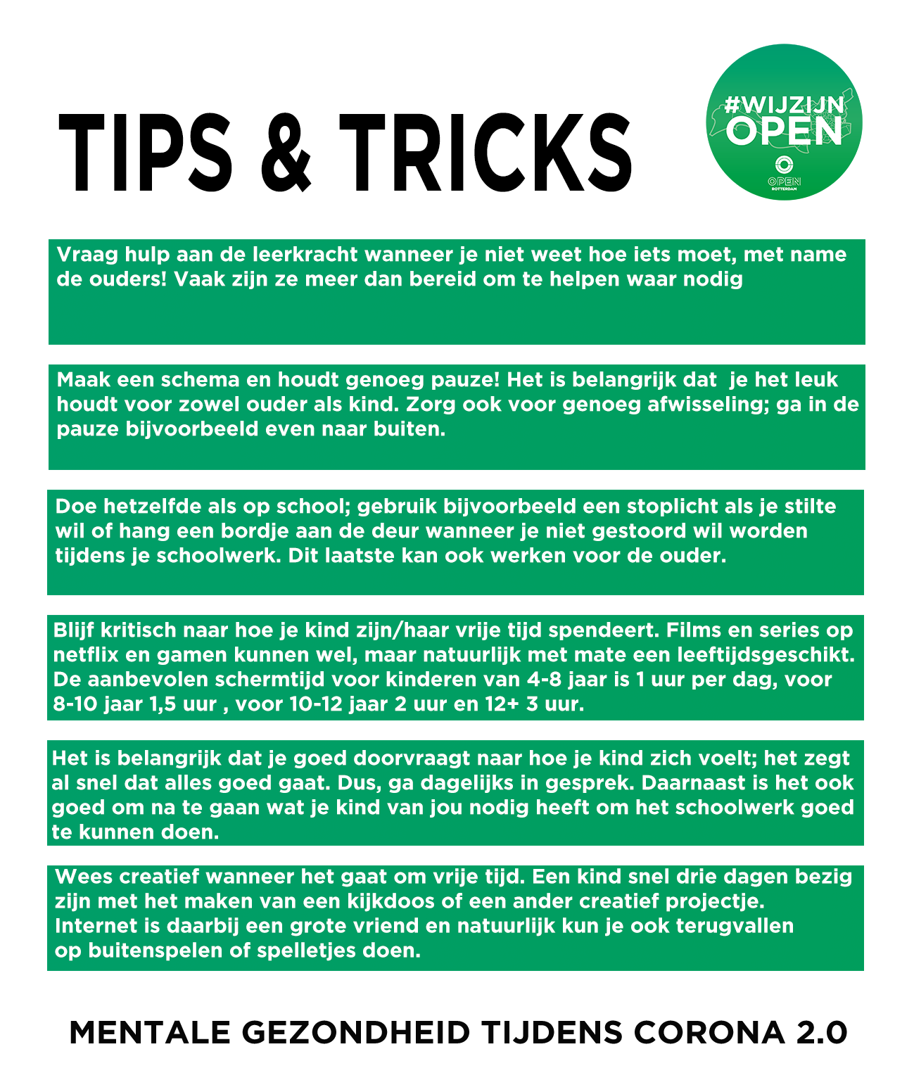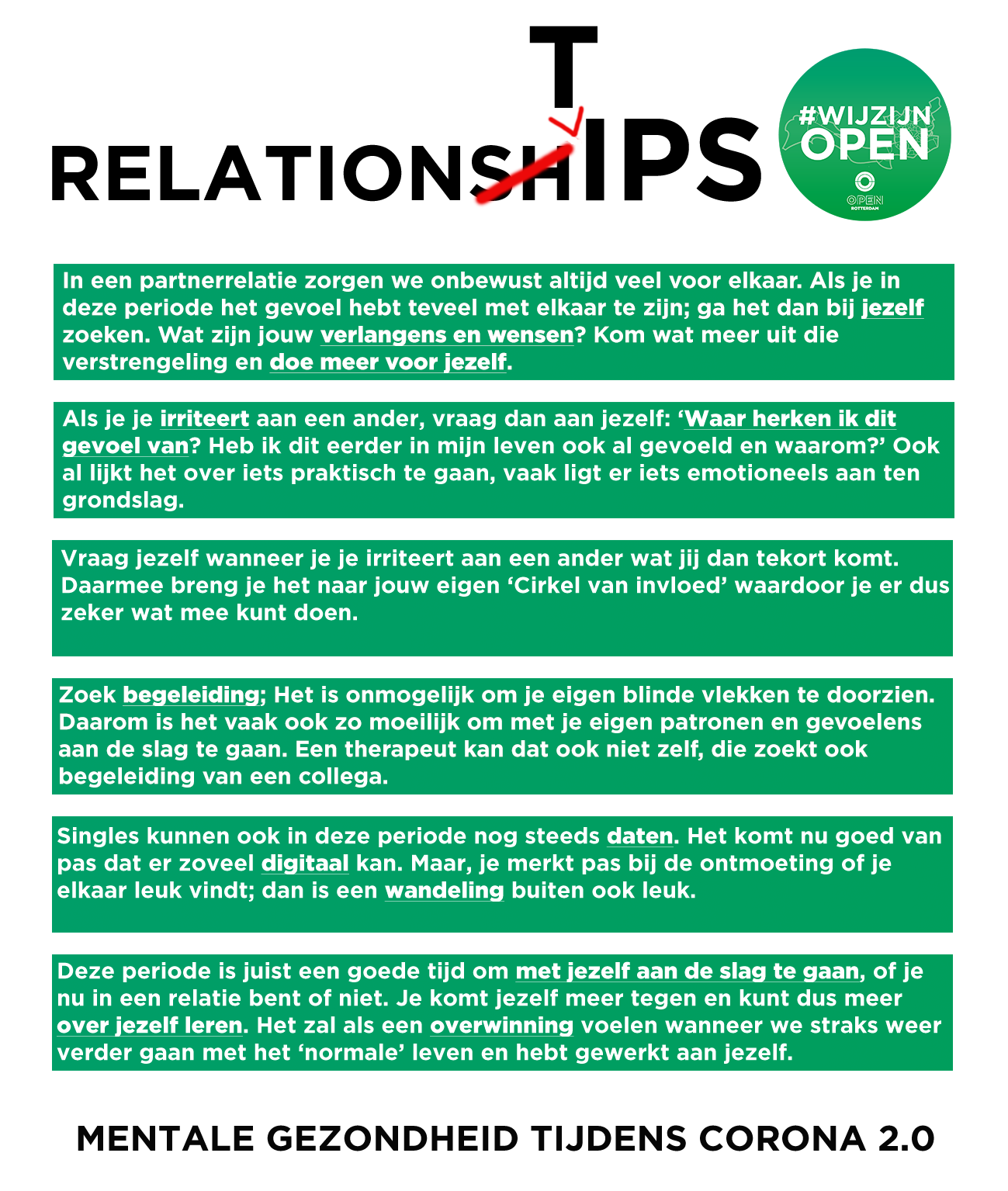 Tijdens de coronacrisis startte Zoë met de serie ‘Mentaal gezond tijdens corona’, waarin zij met verschillende deskundigen, professionals en ervaringsdeskundigen sprak. Tijdens die gesprekken gaven zij en haar gasten tips voor haar kijkers. Hieronder vind je een aantal checklists en tips die zij in de serie gaf. Kijk hier de serie terug voor uitleg en tips.