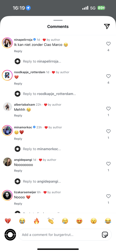 Onder de Instagram-post waarin het restaurant hun sluiting bekendmaakt, stromen vele verdrietige reacties. Velen geven aan Burgertrut te gaan missen en laten verdrietige emoji’s achter onder de post. Sommigen claimen zelfs dat ze nu de ‘beste vegan kapsalon’ van Rotterdam moeten gaan missen.