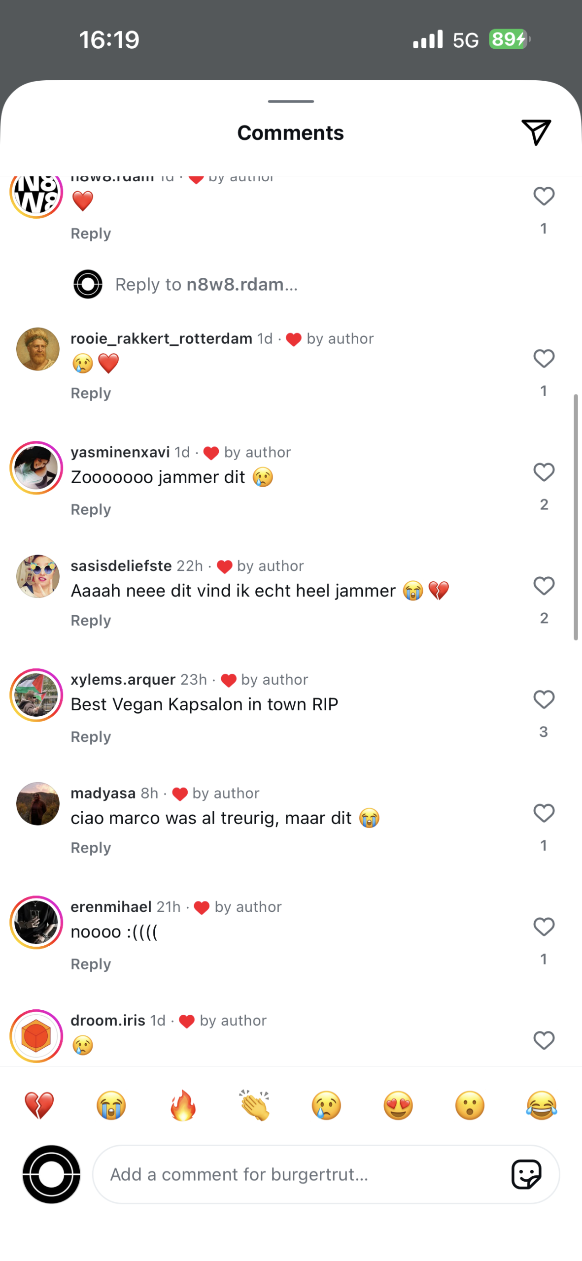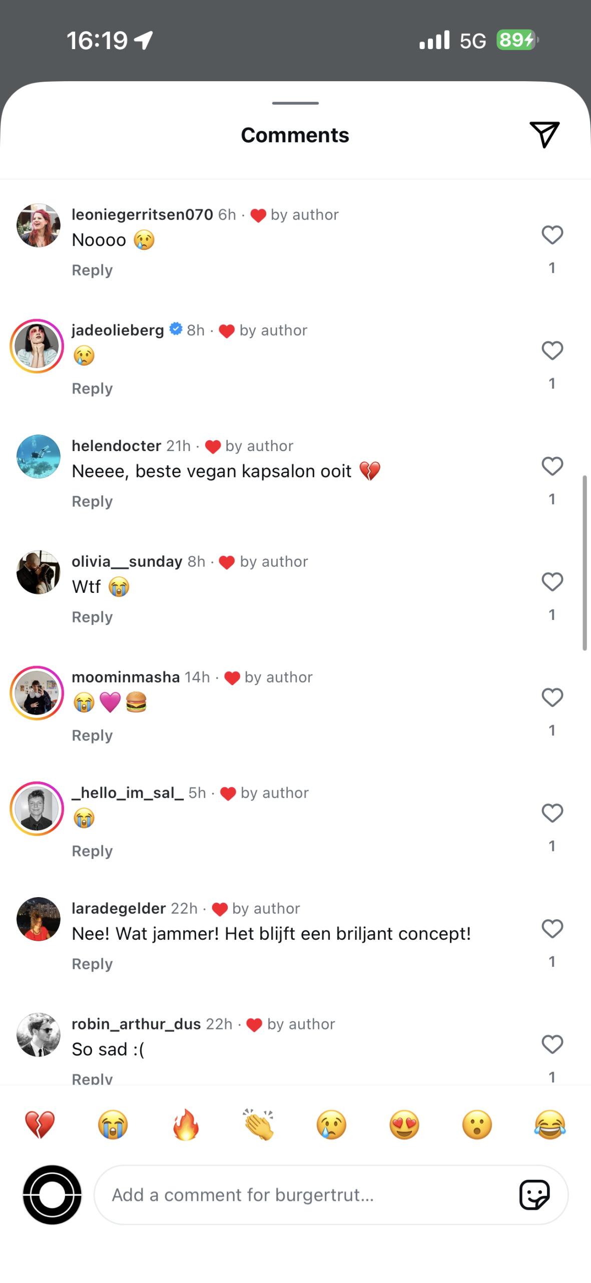 Onder de Instagram-post waarin het restaurant hun sluiting bekendmaakt, stromen vele verdrietige reacties. Velen geven aan Burgertrut te gaan missen en laten verdrietige emoji’s achter onder de post. Sommigen claimen zelfs dat ze nu de ‘beste vegan kapsalon’ van Rotterdam moeten gaan missen.