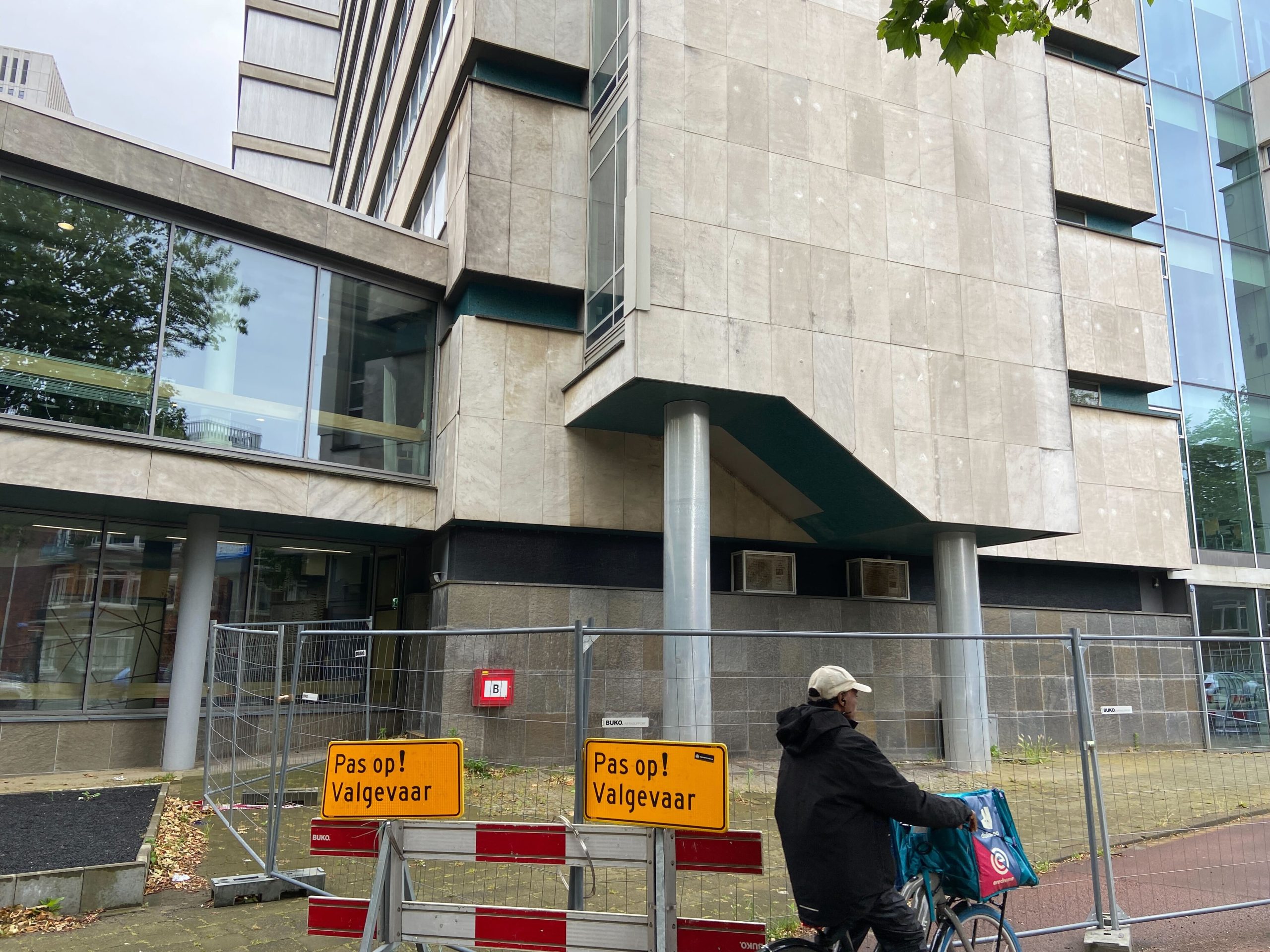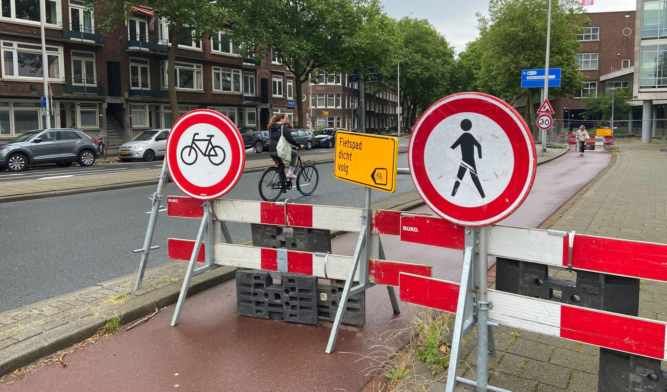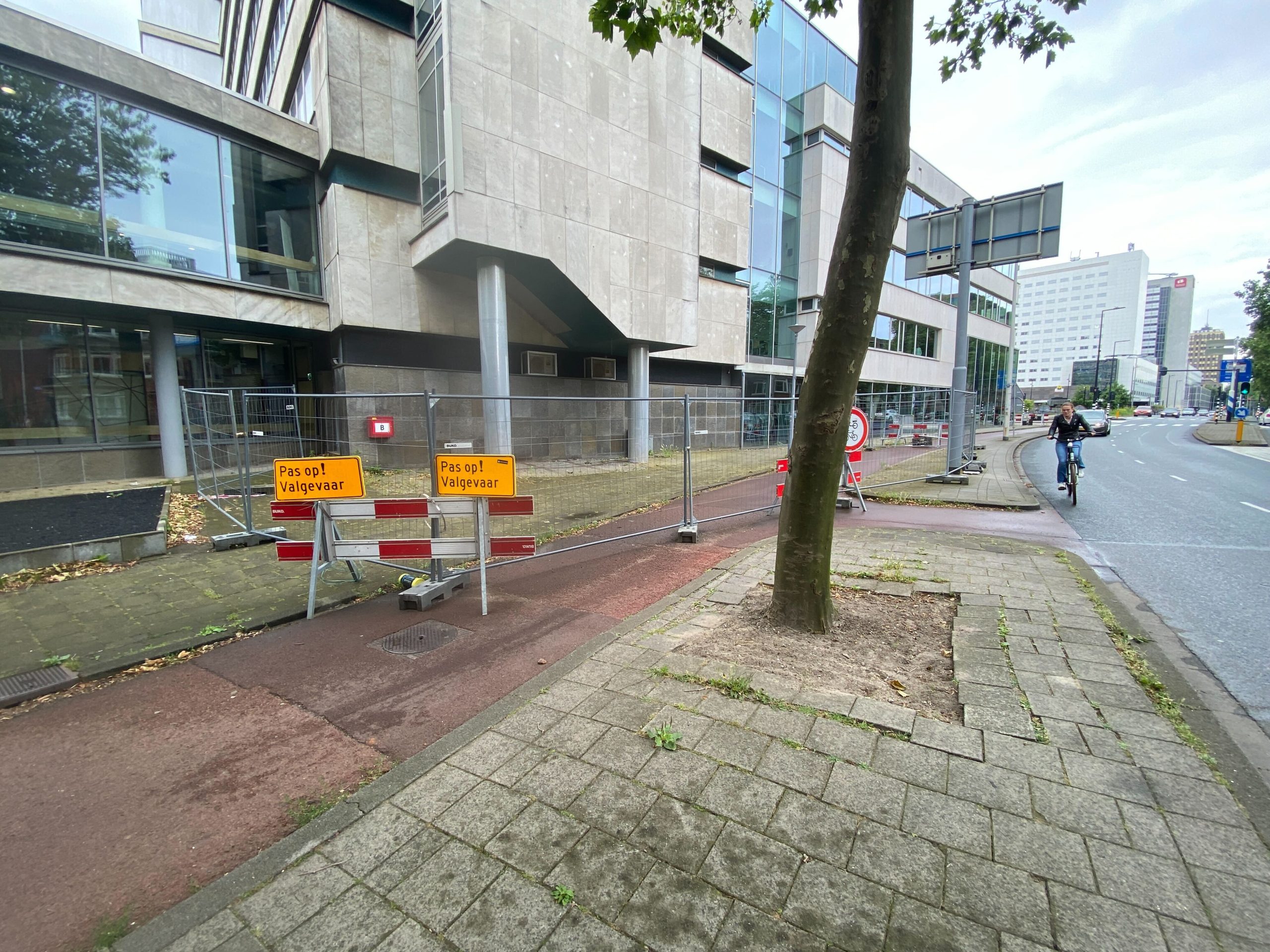 Een stuk fietspad aan de Rochussenstraat, vlak na het Erasmus MC, is sinds begin 2024 al afgesloten. Er staan hekken en borden met ‘Pas op! Valgevaar’ erop, maar er zijn geen werkzaamheden. Het blijkt dat het pand van de Hogeschool Rotterdam langs het fietspad voor risico’s zorgt. Delen van de natuurstenen gevelbekleding kunnen naar beneden vallen.