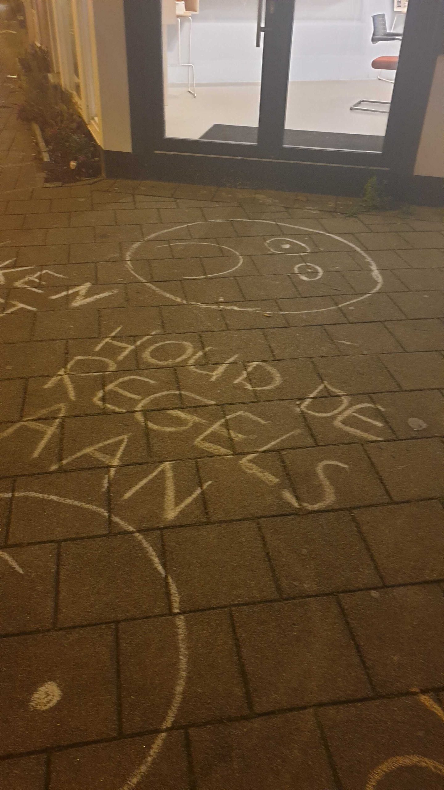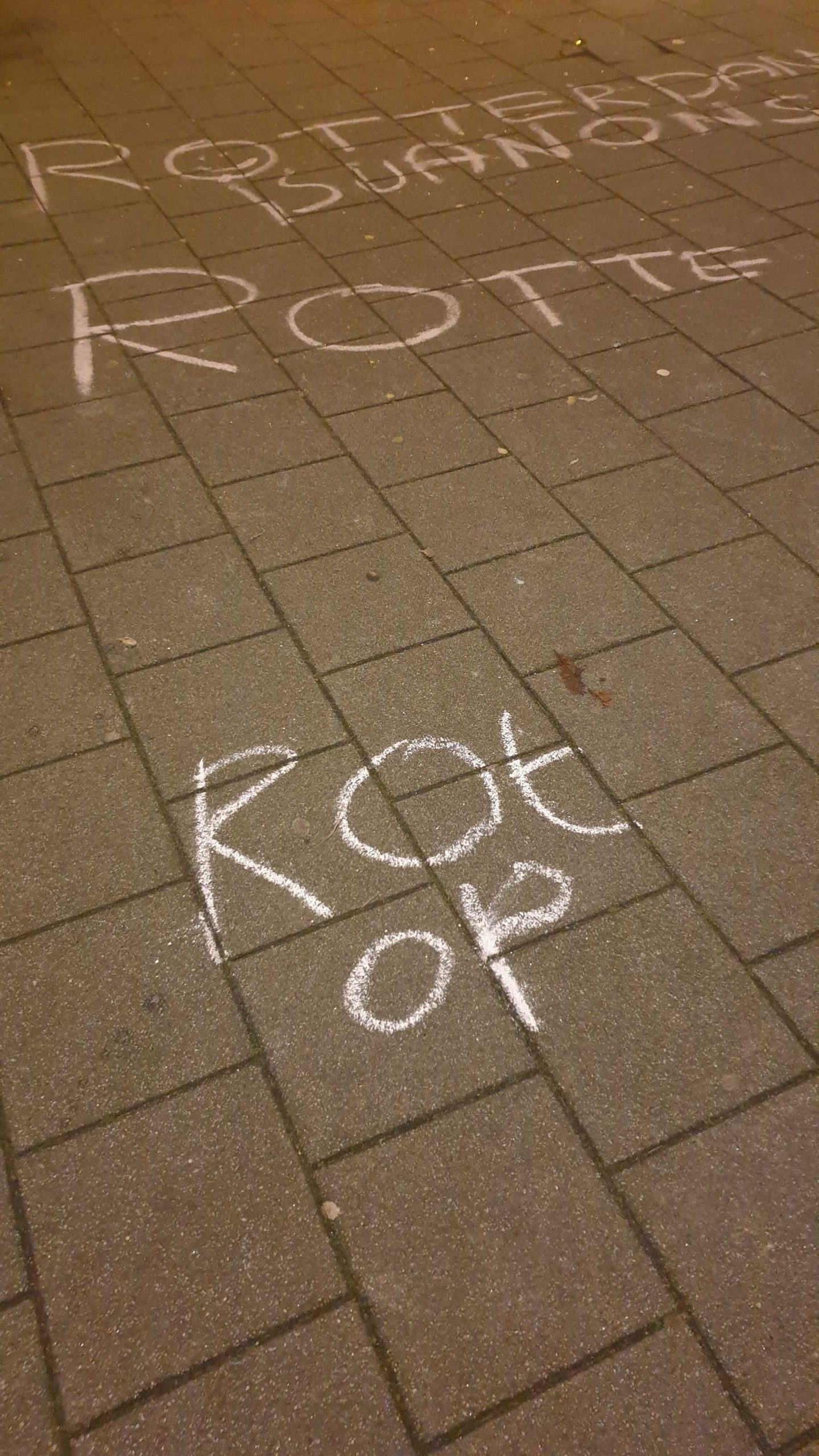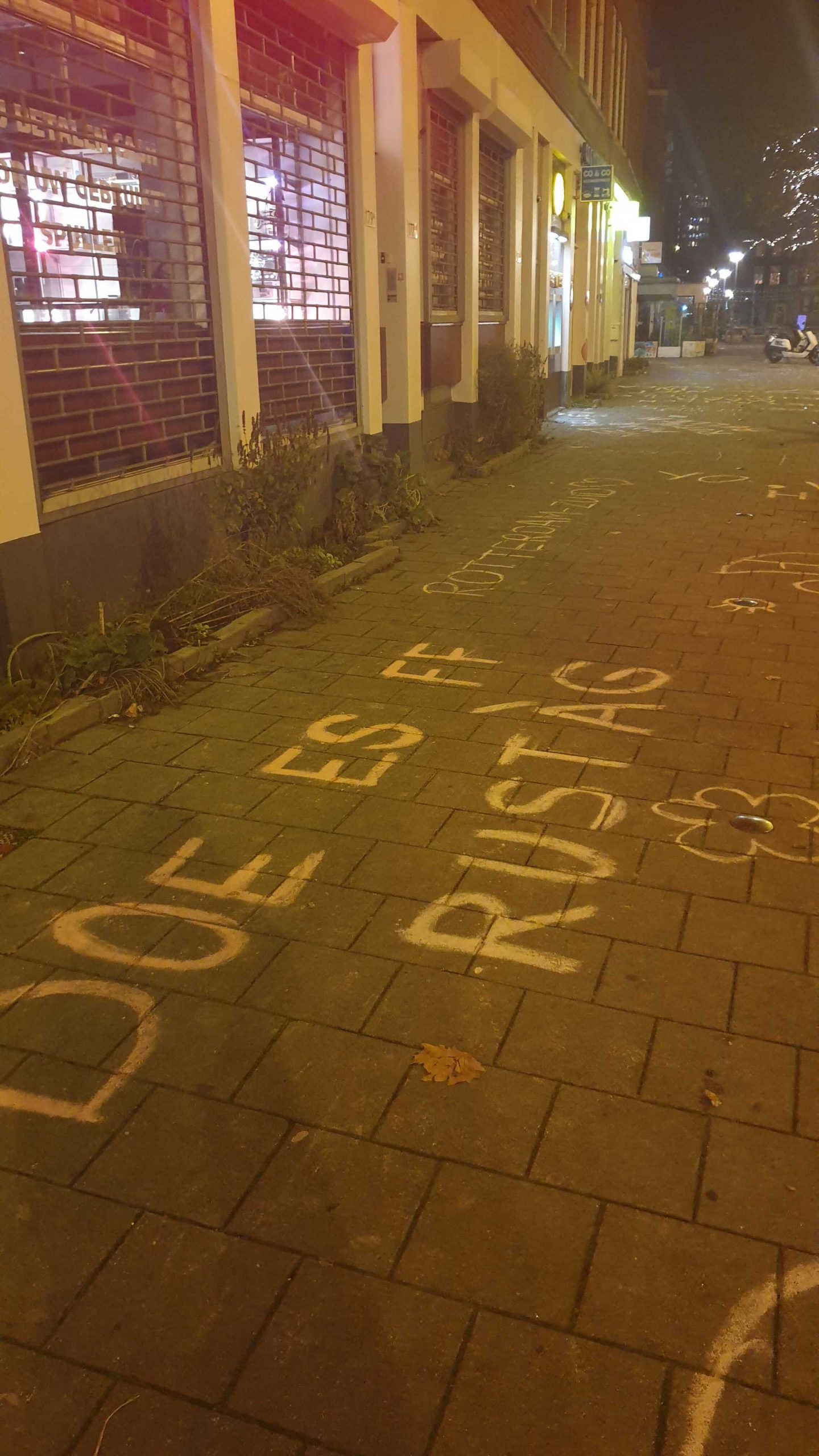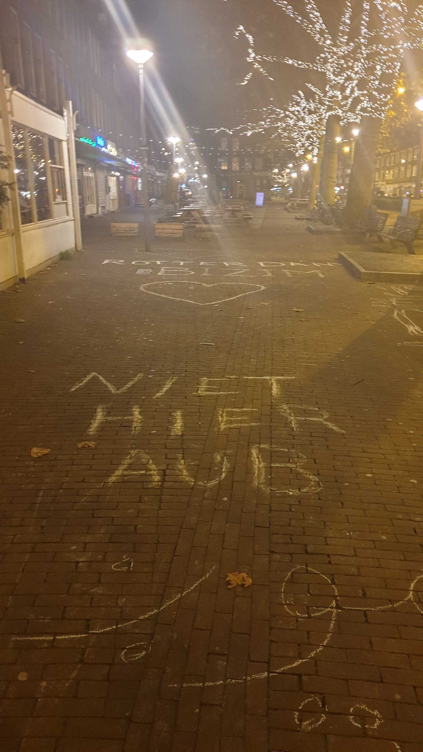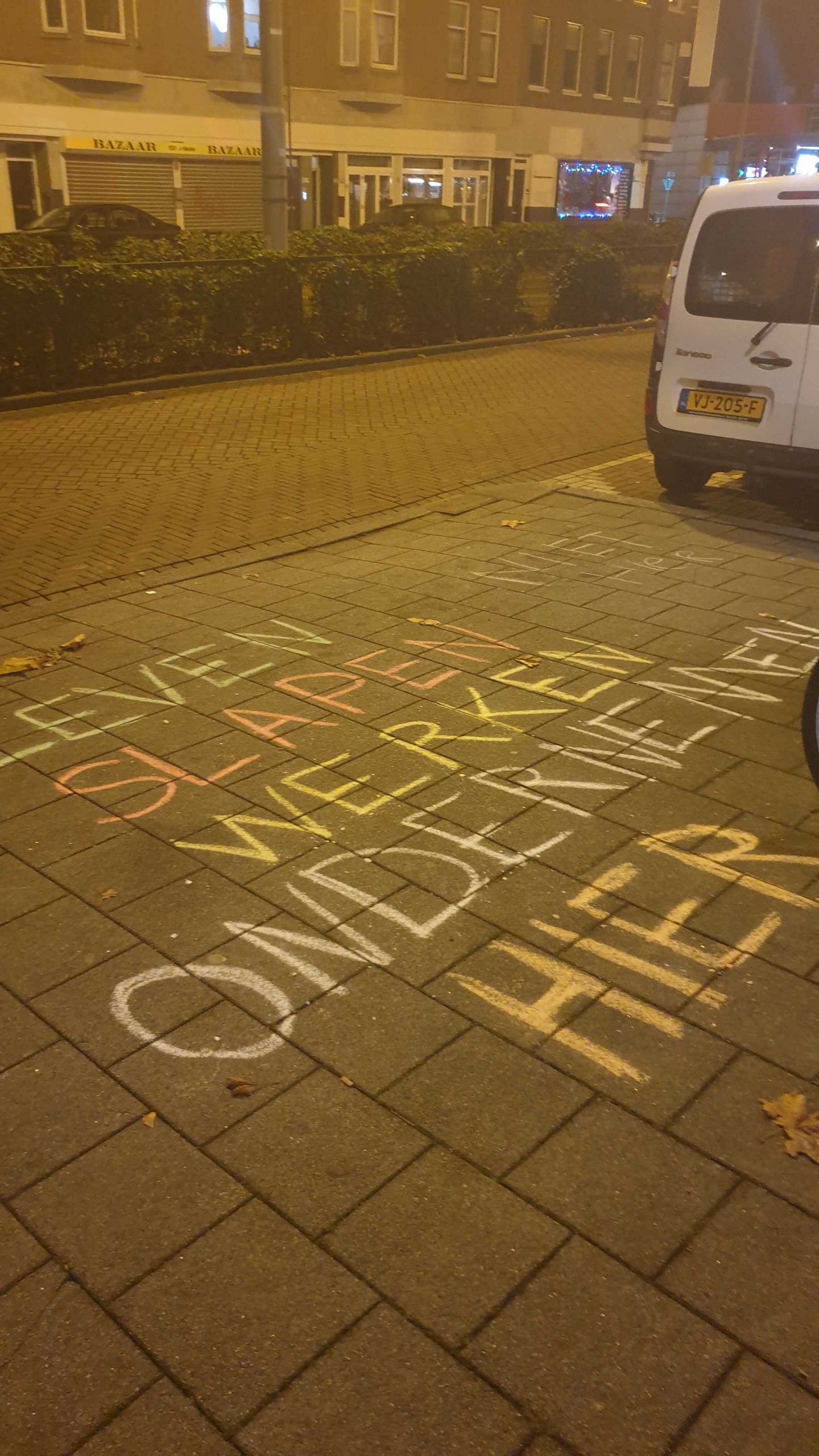 Tientallen boodschappen zijn op de stoep geschreven, onder meer gericht aan potentiële relschoppers. “Hugo de Jonge sucks, maar onze buurt afbreken nog meer”, “Niet rellen, maar Rutte bellen” en “Laten we het gezellig houden” staat er geschreven. Ook hebben tekenaars hun creativiteit de vrije loop gelaten: de stoep is volgetekend met bloemetjes en smileys.